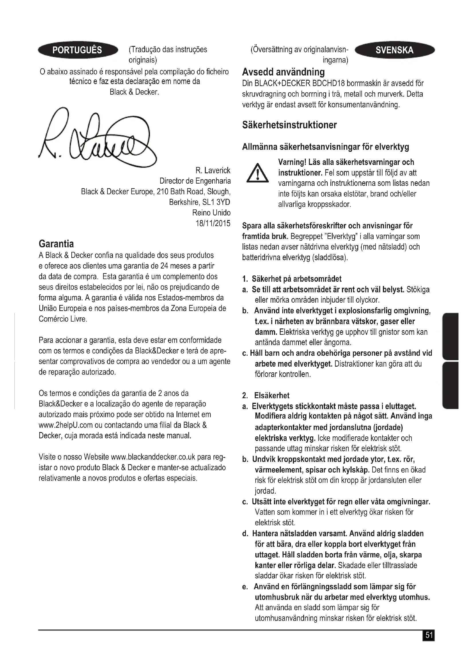 BDCDC18 – Borr/skruvdragare Black & Decker deklarerar att dessa produkter, beskrivna under ”tekniska data” uppfyller: 2006/42/EG, EN 60745-1, EN 60745-2-1 De här produkterna överensstämmer även med direktiven 2004/108/EG (till 2016-04-19) 2014/30/EU (från 2016-04-20) och 2011/65/EU. För ytterligare information, kontakta Black & Decker på följande adress eller se baksidan av bruksanvis- ningen. Undertecknad är ansvarig för sammanställning av den teknis- ka len och gör denna förklaring på Black & Deckers vägnar. R. Laverick Engineering Manager Black & Decker Europe, 210 Bath Road, Slough, Berkshire, SL1 3YD Storbritannien 2015-11-18 Garanti Black & Decker är säker på kvaliteten hos denna produkt och erbjuder kunder 24 månaders garanti från inköpsdatumet. Garantin gäller utöver konsumentens rättigheter enligt lag och påverkar inte dessa. Garantin är giltig i de territorier som tillhör medlemsstaterna i Europeiska unionen och det europeiska frihandelsområdet. För yrkande under garantin måste yrkandet vara in enlighet med Black&Deckers villkor och du kommer att behöva skicka in bevis på köpet till försäljaren eller en auktoriserad reparatör. Villkoren för Black&Deckers tvååriga garanti och var du hittar din närmaste auktoriserade reparatör kan erhållas på internet på www.2helpU.com, eller genom att kontakta ditt lokal Black & Decker kontor på adressen som angetts i denna bruksanvisning. Besök vår webbplats www.blackanddecker.se för att registrera din nya Black & Decker-produkt samt för att få information om nya produkter och specialerbjudanden.58 (Oversettelse av de opprinnelige instruksjonene) NORSK Tiltenkt bruk Drillen BDCHD18 fra BLACK+DECKER er designet for skrut- rekkerbruk og for boring i tre, metall og mur. Dette verktøyet er bare ment som et forbrukerverktøy. Sikkerhetsinstruksjoner Generelle sikkerhetsadvarsler for elektroverktøy
