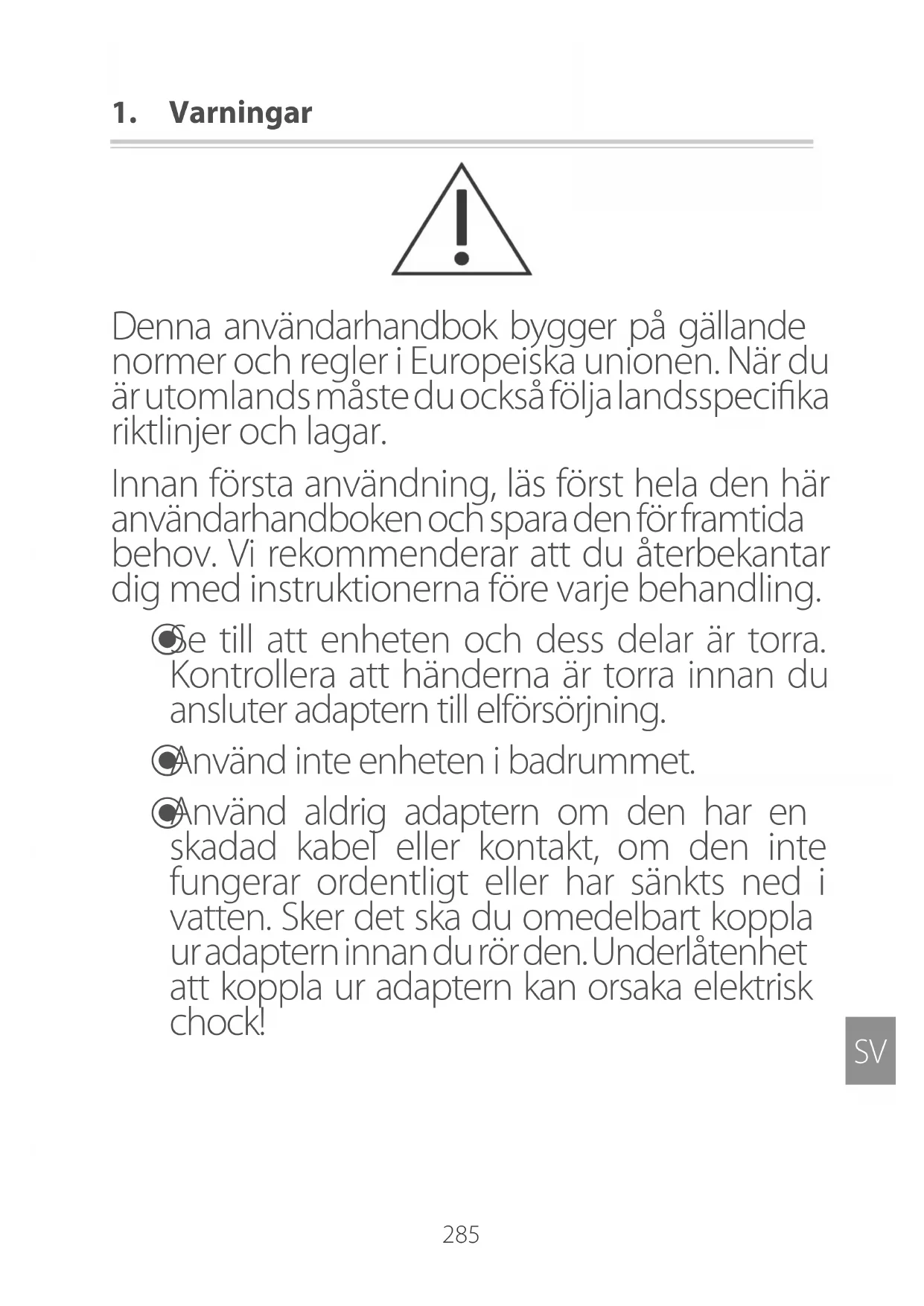 Se till att encheten och dess delar ar torra. Kontrollera att handerna ar torra innan du ansluter adaptertern till elforsorjning.