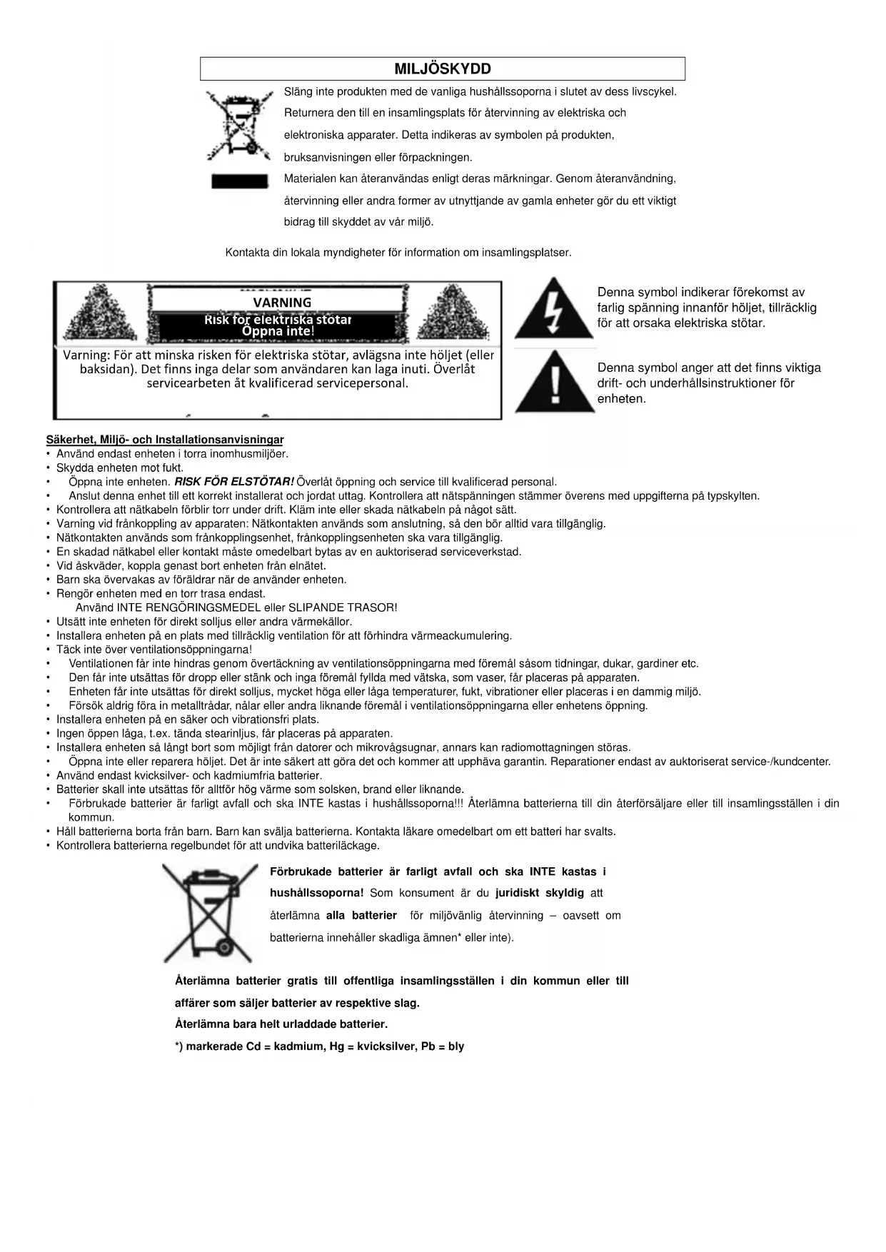 - Förbrukade batterier är farligt avfall och ska INTE kastas i hushållssoporna!!! Återlämna batterierna till din återförsäljare eller till insamlingsställen i din kommun.