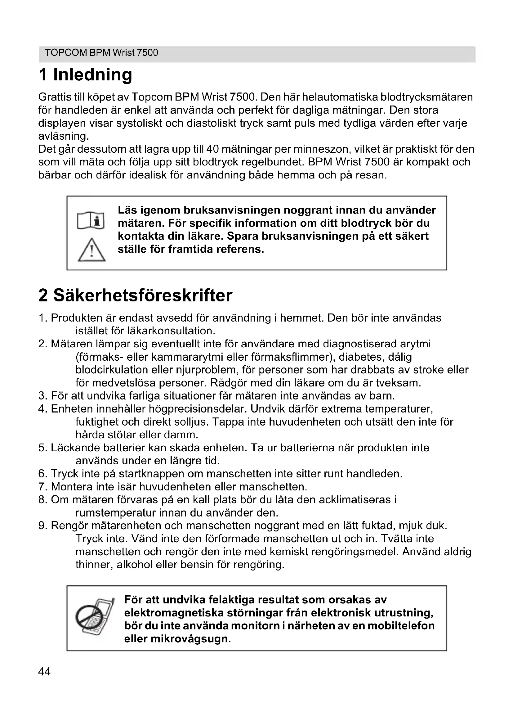 Tryck inte. Vänd inte den förformade manschetten ut och in. Tvätta inte manschetten och rengör den inte med kemiskt rengöringsmedel. Använd aldrig thinner, alkohol eller bensin för rengöring. Läs igenom bruksanvisningen noggrant innan du använder mätaren. För specifik information om ditt blodtryck bör du kontakta din läkare. Spara bruksanvisningen på ett säkert ställe för framtida referens. För att undvika felaktiga resultat som orsakas av elektromagnetiska störningar från elektronisk utrustning, bör du inte använda monitorn i närheten av en mobiltelefon eller mikrovågsugn.45 TOPCOM BPM Wrist 7500 SVENSKA 3Tips Här följer några praktiska tips som hjälper dig att göra mer korrekta avläsningar: