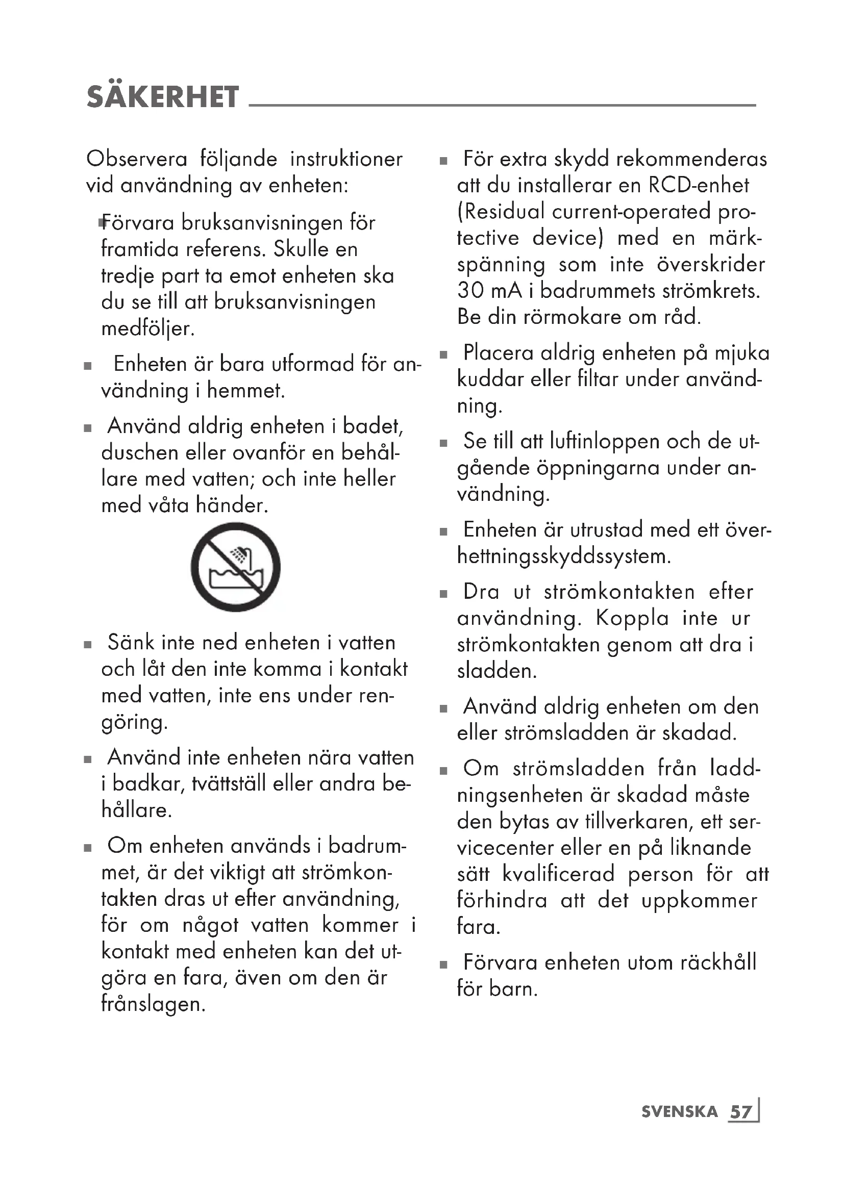 Använd aldrig enheten i badet, duschen eller ovanför en behål- lare med vatten; och inte heller med våta händer.