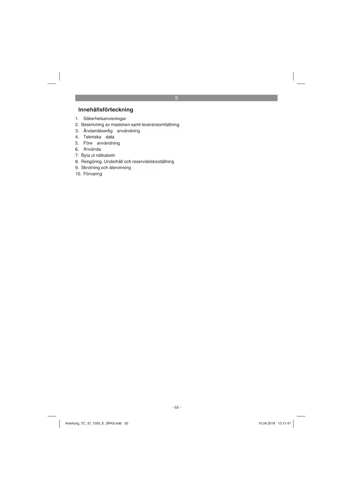 Endast för EU-länder Kasta inte elverktyg i hushållssoporna. Enligt det europeiska direktivet 2012/19/EG om avfall som utgörs av eller innehåller elektriska eller elektroniska produkter och dess tillämpning i den nationella lagstiftningen, måste förbrukade elverktyg källsorteras och lämnas in för miljövänlig återvinning. Återvinnings-alternativ till begäran om återsändning: Som ett alternativ till returnering är ägaren av elutrustningen skyldig att bidraga till ändamålsenlig av- fallshantering för det fall att utrustningen ska skrotas. Efter att den förbrukade utrustningen har lämnats in till en avfallsstation kan den omhändertas i enlighet med gällande nationella lagstiftning om återvin- ning och avfallshantering. Detta gäller inte för tillbehörsdelar och hjälpmedel utan elektriska komponen- ter vars syfte har varit att komplettera den förbrukade utrustningen. Eftertryck eller annan duplicering av dokumentation och medföljande underlag för produkterna, även utdrag, är endast tillåtet med uttryckligt tillstånd från iSC GmbH. Med förbehåll för tekniska ändringar. Anleitung_TC_ID_1000_E_SPK9.indb 62Anleitung_TC_ID_1000_E_SPK9.indb 62 16.04.2018 13:11:4816.04.2018 13:11:48S