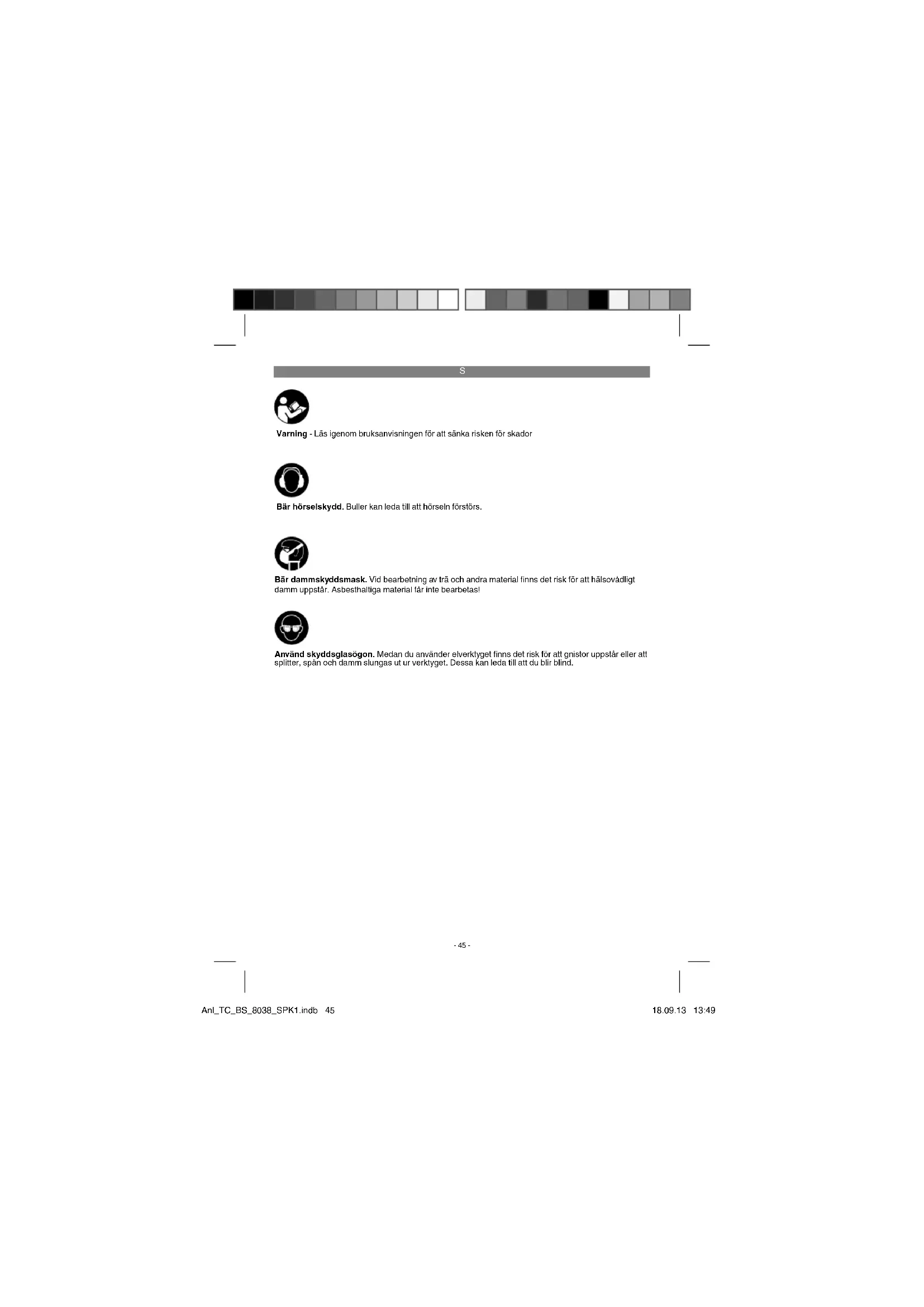 Varning - Läs igenom bruksanvisningen för att sänka risken för skador Bär hörselskydd. Buller kan leda till att hörseln förstörs. Använd skyddsglasögon. Medan du använder elverktyget fi nns det risk för att gnistor uppstår eller att splitter, spån och damm slungas ut ur verktyget. Dessa kan leda till att du blir blind. Bär dammskyddsmask. Vid bearbetning av trä och andra material fi nns det risk för att hälsovådligt damm uppstår. Asbesthaltiga material får inte bearbetas! Anl_TC_BS_8038_SPK1.indb 45Anl_TC_BS_8038_SPK1.indb 45 18.09.13 13:4918.09.13 13:49S