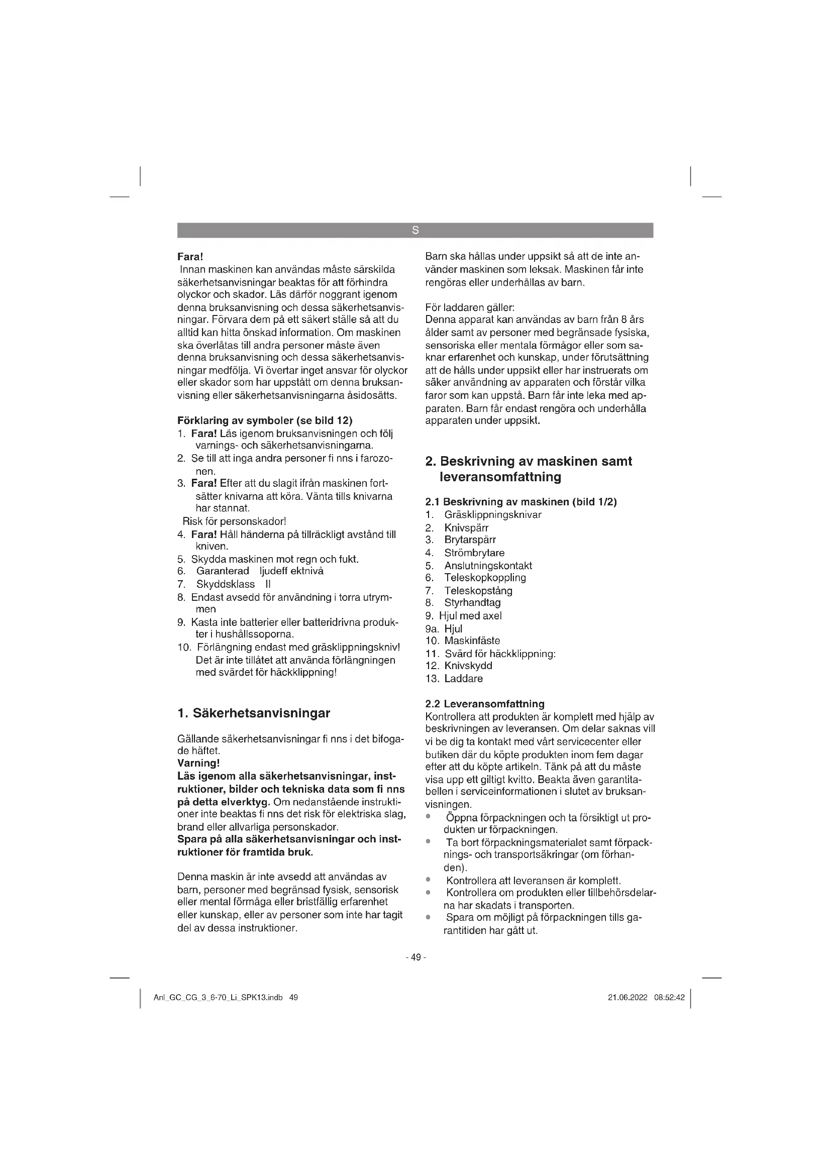 Spara om möjligt på förpackningen tills ga- rantitiden har gått ut. Anl_GC_CG_3_6-70_Li_SPK13.indb 49Anl_GC_CG_3_6-70_Li_SPK13.indb 49 21.06.2022 08:52:4221.06.2022 08:52:42S