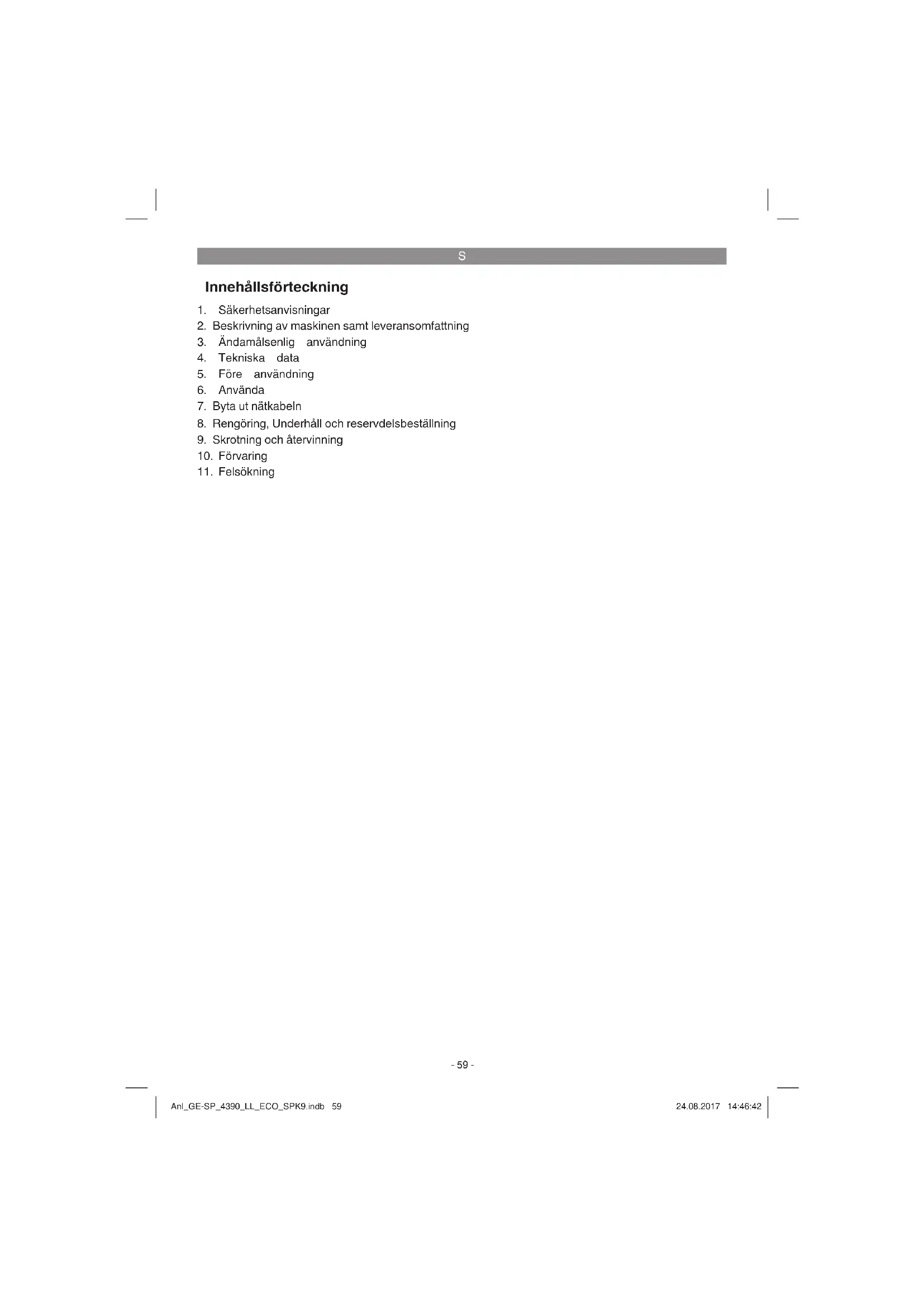 Endast för EU-länder Kasta inte elverktyg i hushållssoporna. Enligt det europeiska direktivet 2012/19/EG om avfall som utgörs av eller innehåller elektriska eller elektroniska produkter och dess tillämpning i den nationella lagstiftningen, måste förbrukade elverktyg källsorteras och lämnas in för miljövänlig återvinning. Återvinnings-alternativ till begäran om återsändning: Som ett alternativ till returnering är ägaren av elutrustningen skyldig att bidraga till ändamålsenlig av- fallshantering för det fall att utrustningen ska skrotas. Efter att den förbrukade utrustningen har lämnats in till en avfallsstation kan den omhändertas i enlighet med gällande nationella lagstiftning om återvin- ning och avfallshantering. Detta gäller inte för tillbehörsdelar och hjälpmedel utan elektriska komponen- ter vars syfte har varit att komplettera den förbrukade utrustningen. Eftertryck eller annan duplicering av dokumentation och medföljande underlag för produkterna, även utdrag, är endast tillåtet med uttryckligt tillstånd från iSC GmbH. Med förbehåll för tekniska ändringar. Anl_GE-SP_4390_LL_ECO_SPK9.indb 66Anl_GE-SP_4390_LL_ECO_SPK9.indb 66 24.08.2017 14:46:4424.08.2017 14:46:44S