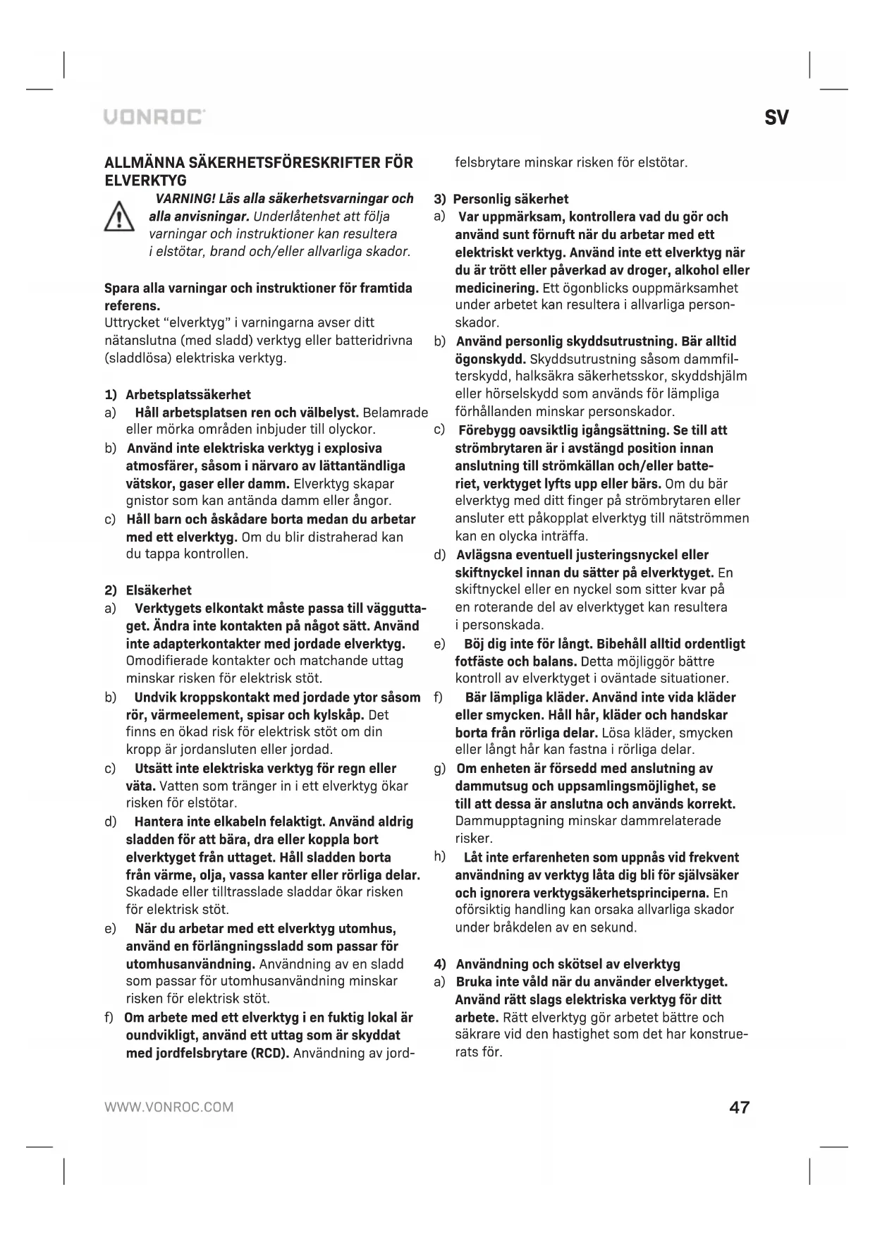 Stäng alltid av maskinen och ta ut batteriet från maskinen innan rengöring och underhåll. Rengör maskinen hus regelbundet med en mjuk trasa, helst efter varje gång du använder maskinen. Se till att ventilationsöppningarna är fria från damm och smuts. Ta bort mycket ihållande smuts med en mjuk trasa fuktad med tvållösning. Använd inte lösningsmedel som bensin, alkohol, ammoniak osv. Sådana kemikalier skadar de syntetiska kompo- nenterna. MILJÖ Felaktig och/eller kasserad elektrisk eller elektronisk utrustning måste lämnas in på lämpliga återvinningsstationer. Endast för EU-länder Kassera inte elverktyg ihushållsavfall. Enligt den europeiska riktlinjen 2012/19/EC om kasserad elektrisk och elektronisk utrustning och dess tillämpning inationell rätt måste elverktyg som inte längre är användbara samlas in separat och kasseras på ett miljövänligt sätt. GARANTI VONROC-produkter är utvecklade enligt högsta kvalitetsstandard och garanteras fria från defekter ibåde material och utförande under den period som lagen föreskriver från och med inköpsdatumet. Om produkten skulle utveckla fel under denna peri- od på grund av defekt material och/eller utförande, kontakta då VONROC direkt. Följande omständigheter är undantagna från denna garanti: