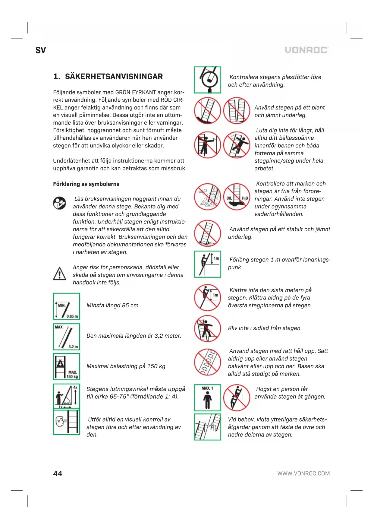 Minsta längd 85 cm. Den maximala längden är 3,2 meter. Maximal belastning på 150 kg. Stegens lutningsvinkel måste uppgå till cirka 65-75° (förhållande 1: 4). Utför alltid en visuell kontroll av stegen före och efter användning av den. Kontrollera stegens plastfötter före och efter användning. Använd stegen på ett plant och jämnt underlag. Luta dig inte för långt, håll alltid ditt bältesspänne innanför benen och båda fötterna på samma stegpinne/steg under hela arbetet. Kontrollera att marken och stegen är fria från förore- ningar. Använd inte stegen under ogynnsamma väderförhållanden. Använd stegen på ett stabilt och jämnt underlag. Förläng stegen 1 m ovanför landnings- punk Klättra inte den sista metern på stegen. Klättra aldrig på de fyra översta stegpinnarna på stegen. Kliv inte isidled från stegen. Använd stegen med rätt håll upp. Sätt aldrig upp eller använd stegen bakvänt eller upp och ner. Basen ska alltid stå stadigt på marken. Högst en person får använda stegen åt gången. Vid behov, vidta ytterligare säkerhets- åtgärder genom att fästa de övre och nedre delarna av stegen.SV