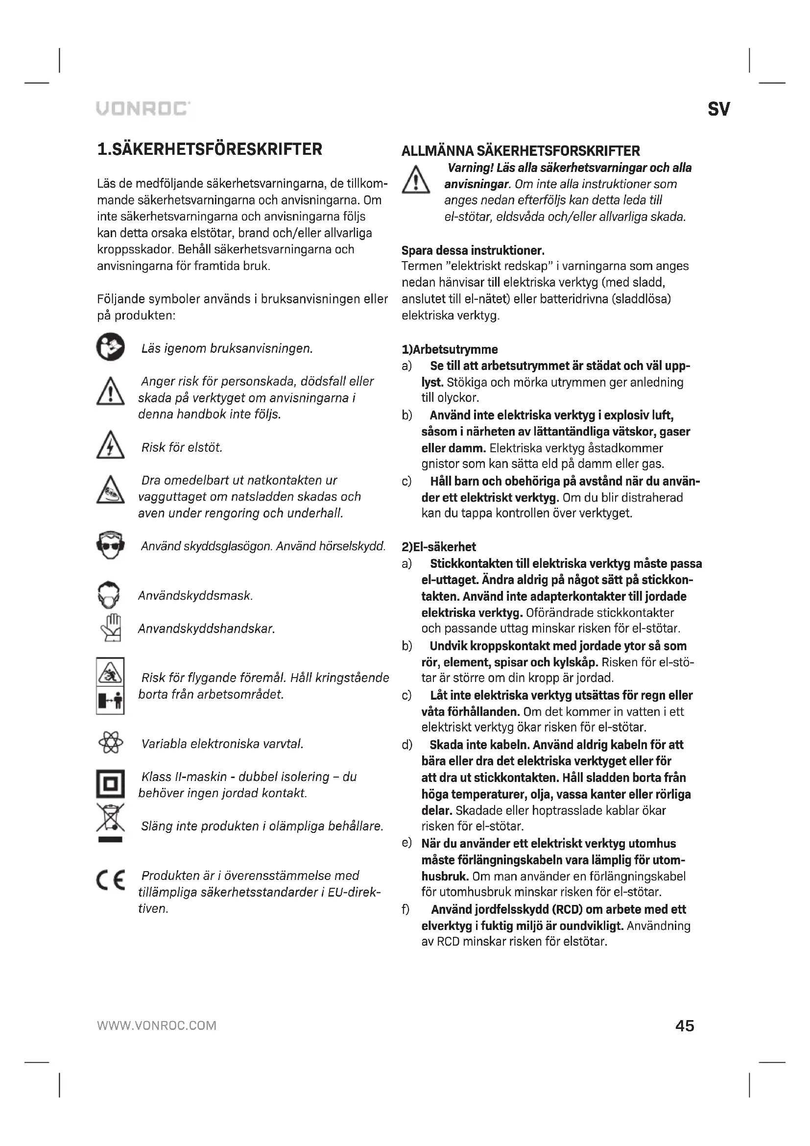 Innan rengöring och underhåll ska du alltid stänga av maskinen och dra ut nätkontak- ten ur vägguttaget. Rengör maskinen hus regelbundet med en mjuk trasa, helst efter varje gång du använder maskinen. Se till att ventilationsöppningarna är fria från damm och smuts. Ta bort mycket ihållande smuts med en mjuk trasa fuktad med tvållösning. Använd inte lösningsmedel som bensin, alkohol, ammoniak osv. Sådana kemikalier skadar de syntetiska kompo- nenterna. MILJÖ Felaktig och/eller kasserad elektrisk eller elektronisk utrustning måste lämnas in på lämpliga återvinningsstationer. Endast för EU-länder Släng inte elverktyg i hushållsavfallet. Enligt det europeiska WEEE-direktivet 2012/19/EU för avfall från elektrisk och elektronisk utrustning och dess tillämpning nationellt ska elverktyg som inte längre kan användas samlas in separat och kasseras på ett miljövänligt sätt. GARANTI VONROC produkter är utvecklade enligt högsta kva- litetsstandard och garanteras vara utan defekter både vad gäller material och tillverkning under den period som stipuleras enligt lag med början från ursprungligt inköpsdatum. Om något fel uppstår på produkten under denna period på grund av material- och/eller tillverkningsfel skall VONROC kontaktas direkt. Följande omständigheter exkluderas från denna garanti: