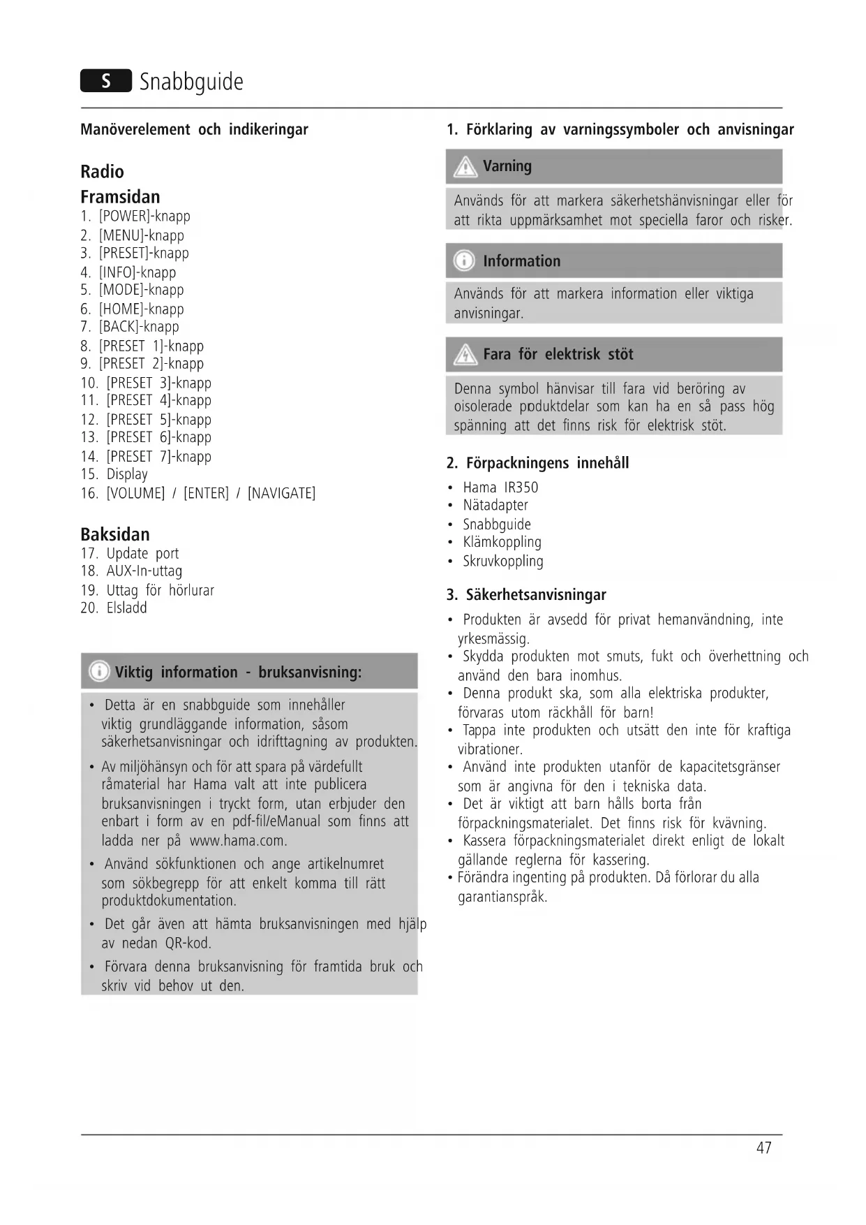 Ladda ner instruktionerna för din Radio i PDF-format gratis! Hitta din manual IR350M - HAMA och ta tillbaka ditt elektroniska enhet i hand. På denna sida publiceras alla dokument som behövs för att använda din enhet. IR350M av märket HAMA.