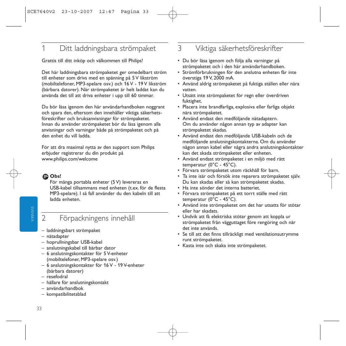 Lisez attentivement ce manuel d’utilisation et conservez-le précieusement, car il contient des informations relatives à la sécurité et à l’utilisation de ce bloc d’alimentation. Avant toute utilisation, lisez toutes les instructions et consignes de sécurité apposées sur le bloc d’alimentation et les appareils à charger. Pour profiter pleinement de l’assistance Philips, enregistrez votre produit sur le site: www.philips.com/welcome. Remarque: Un cáble USB est fourni avec certains appareils portables (5 V), avec la plupart des lecteurs MP3 par exemple.Vous pouvez dans ce cas également utiliser ce cáble pour charger votre appareil.
