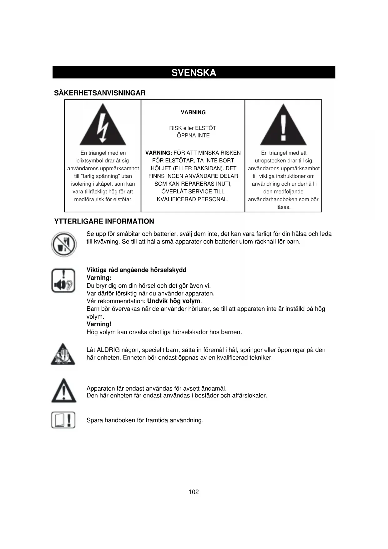 Låt ALDRIG någon, speciellt barn, sätta in föremål i hål, springor eller öppningar på den här enheten. Enheten bör endast öppnas av en kvalificerad tekniker.