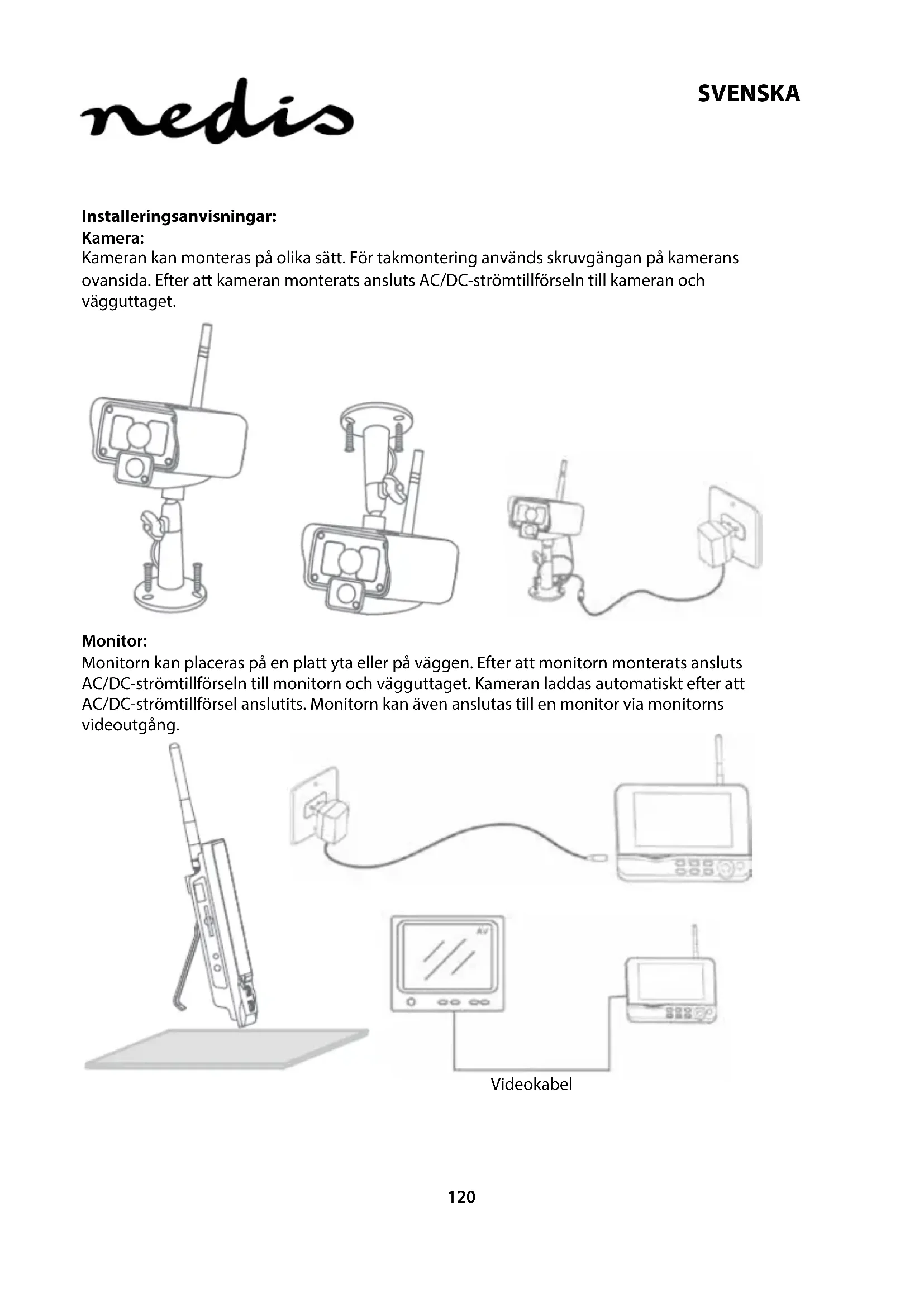 SVENSKA Installeringsanvisningar: Kamera: Kameran kan monteras på olika sätt. För takmontering används skruvgängan på kamerans ovansida. Efter att kameran monterats ansluts AC/DC-strömtillförseln till kameran och vägguttaget. Monitor: Monitorn kan placeras på en platt yta eller på väggen. Efter att monitorn monterats ansluts AC/DC-strömtillförseln till monitorn och vägguttaget. Kameran laddas automatiskt efter att AC/DC-strömtillförsel anslutits. Monitorn kan även anslutas till en monitor via monitorns videoutgång. Videokabel121 SVENSKA Användarinstruktioner: