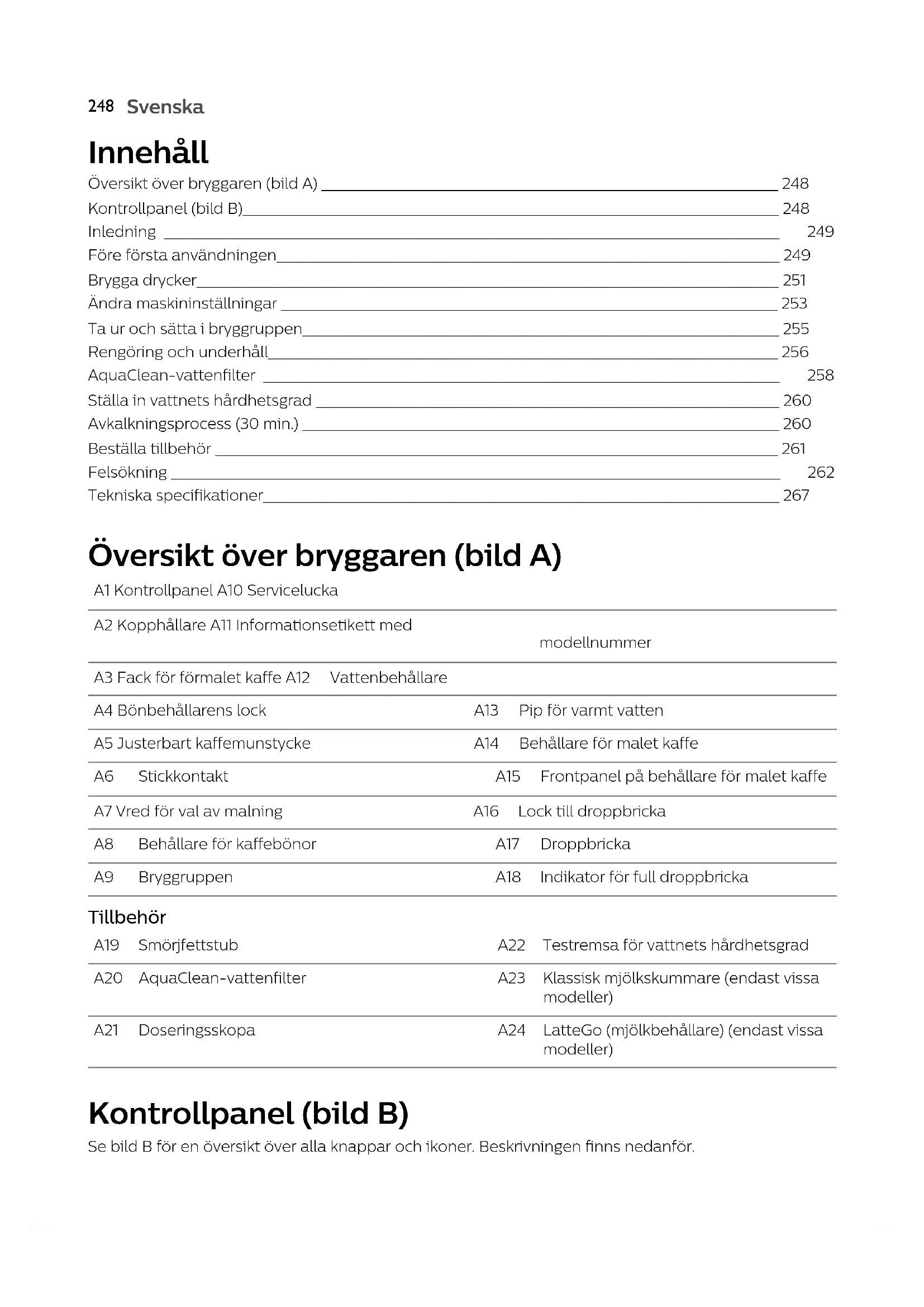 Svenska Innehåll Översikt över bryggaren (bild A) _____________________________________________________________________ 248 Kontrollpanel (bild B)_________________________________________________________________________________ 248 Inledning _____________________________________________________________________________________________ 249 Före första användningen____________________________________________________________________________ 249 Brygga drycker________________________________________________________________________________________ 251 Ändra maskininställningar ___________________________________________________________________________ 253 Ta ur och sätta i bryggruppen________________________________________________________________________ 255 Rengöring och underhåll_____________________________________________________________________________ 256 AquaClean-vattenfilter ______________________________________________________________________________ 258 Ställa in vattnets hårdhetsgrad ______________________________________________________________________ 260 Avkalkningsprocess (30 min.) ________________________________________________________________________ 260 Beställa tillbehör _____________________________________________________________________________________ 261 Felsökning ____________________________________________________________________________________________ 262 Tekniska specifikationer______________________________________________________________________________ 267 Översikt över bryggaren (bild A) A1 Kontrollpanel A10 Servicelucka A2 Kopphållare A11 Informationsetikett med modellnummer A3 Fack för förmalet kaffe A12 Vattenbehållare A4 Bönbehållarens lock A13 Pip för varmt vatten A5 Justerbart kaffemunstycke A14 Behållare för malet kaffe A6 Stickkontakt A15 Frontpanel på behållare för malet kaffe A7 Vred för val av malning A16 Lock till droppbricka A8 Behållare för kaffebönor A17 Droppbricka A9 Bryggruppen A18 Indikator för full droppbricka Tillbehör A19 Smörjfettstub A22 Testremsa för vattnets hårdhetsgrad A20 AquaClean-vattenfilter A23 Klassisk mjölkskummare (endast vissa modeller) A21 Doseringsskopa A24 LatteGo (mjölkbehållare) (endast vissa modeller) Kontrollpanel (bild B) Se bild B för en översikt över alla knappar och ikoner. Beskrivningen finns nedanför.249 Svenska Svenska En del av knapparna/ikonerna finns endast på vissa modeller. B1 På/av-knapp B7 Varningsikoner B2 Dryckesikoner* B8 Startlampa B3 Ikon för aromstyrka/förmalet kaffe B9 Start/stopp -knapp B4 Ikon för dryckesmängd B10 Ikon för avkalkning B5 Ikon för mjölkmängd (endast vissa modeller) B11 AquaClean-ikon B6 Ikon för kaffetemperatur (endast vissa modeller) *Dryckesikoner: espresso, espresso lungo, kaffe, americano, cappuccino, latte macchiato, varmt vatten, ånga (endast vissa modeller) Inledning Grattis till ditt köp av en helautomatisk kaffebryggare från Philips! För att dra full nytta av den support som Philips erbjuder kan du registrera din produkt på www.philips.com/welcome. Läs noggrant det separata häftet med säkerhetsinformation innan du använder bryggaren för första gången och spara det för framtida bruk. För att du ska komma igång och få ut mesta möjliga av din kaffebryggare erbjuder Philips support på olika sätt. I förpackningen hittar du: 1 Den här användarhandboken med bildbaserade instruktioner och mer detaljerad information om rengöring och underhåll. Det finns många versioner av den här espressobryggaren och de har olika funktioner. Versionerna har olika modellnummer. Modellnumret finns på etiketten insidan av underhållsluckan (se bild A11). 2 Det separata säkerhetshäftet med instruktioner för hur du använder apparaten på ett säkert sätt. 3 Om du vill ha onlinesupport (vanliga frågor, filmer m.m.) skannar du QR-koden på utsidan av detta häfte eller går in på www.philips.com/coffee-care Den här bryggaren har testats med riktigt kaffe. Även om den har rengjorts mycket noggrant kan det finnas vissa kafferester kvar. Men, vi garanterar dig att din bryggare är helt ny. Bryggaren anpassar automatiskt mängden malet kaffe som används för att få fram ett kaffe med bästa möjliga smak. Du bör börja med att brygga 5 koppar för att låta bryggaren slutföra sin självjustering. Se till att skölja LatteGo (mjölkbehållaren) eller den klassiska mjölkskummaren före första användningen. Före första användningen