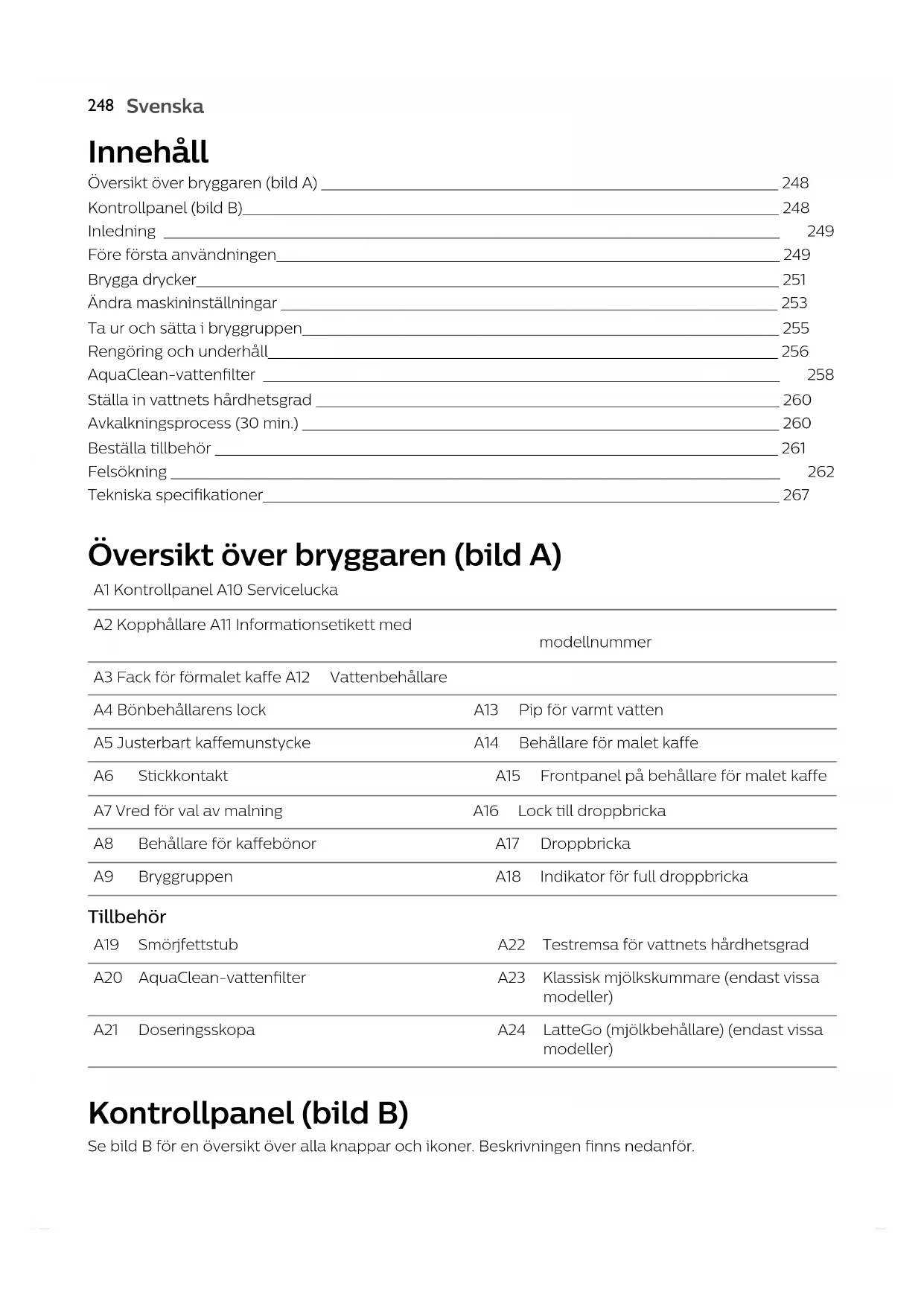 Svenska Innehåll Översikt över bryggaren (bild A) _____________________________________________________________________ 248 Kontrollpanel (bild B)_________________________________________________________________________________ 248 Inledning _____________________________________________________________________________________________ 249 Före första användningen____________________________________________________________________________ 249 Brygga drycker________________________________________________________________________________________ 251 Ändra maskininställningar ___________________________________________________________________________ 253 Ta ur och sätta i bryggruppen________________________________________________________________________ 255 Rengöring och underhåll_____________________________________________________________________________ 256 AquaClean-vattenfilter ______________________________________________________________________________ 258 Ställa in vattnets hårdhetsgrad ______________________________________________________________________ 260 Avkalkningsprocess (30 min.) ________________________________________________________________________ 260 Beställa tillbehör _____________________________________________________________________________________ 261 Felsökning ____________________________________________________________________________________________ 262 Tekniska specifikationer______________________________________________________________________________ 267 Översikt över bryggaren (bild A) A1 Kontrollpanel A10 Servicelucka A2 Kopphållare A11 Informationsetikett med modellnummer A3 Fack för förmalet kaffe A12 Vattenbehållare A4 Bönbehållarens lock A13 Pip för varmt vatten A5 Justerbart kaffemunstycke A14 Behållare för malet kaffe A6 Stickkontakt A15 Frontpanel på behållare för malet kaffe A7 Vred för val av malning A16 Lock till droppbricka A8 Behållare för kaffebönor A17 Droppbricka A9 Bryggruppen A18 Indikator för full droppbricka Tillbehör A19 Smörjfettstub A22 Testremsa för vattnets hårdhetsgrad A20 AquaClean-vattenfilter A23 Klassisk mjölkskummare (endast vissa modeller) A21 Doseringsskopa A24 LatteGo (mjölkbehållare) (endast vissa modeller) Kontrollpanel (bild B) Se bild B för en översikt över alla knappar och ikoner. Beskrivningen finns nedanför.249 Svenska Svenska En del av knapparna/ikonerna finns endast på vissa modeller. B1 På/av-knapp B7 Varningsikoner B2 Dryckesikoner* B8 Startlampa B3 Ikon för aromstyrka/förmalet kaffe B9 Start/stopp -knapp B4 Ikon för dryckesmängd B10 Ikon för avkalkning B5 Ikon för mjölkmängd (endast vissa modeller) B11 AquaClean-ikon B6 Ikon för kaffetemperatur (endast vissa modeller) *Dryckesikoner: espresso, espresso lungo, kaffe, americano, cappuccino, latte macchiato, varmt vatten, ånga (endast vissa modeller) Inledning Grattis till ditt köp av en helautomatisk kaffebryggare från Philips! För att dra full nytta av den support som Philips erbjuder kan du registrera din produkt på www.philips.com/welcome. Läs noggrant det separata häftet med säkerhetsinformation innan du använder bryggaren för första gången och spara det för framtida bruk. För att du ska komma igång och få ut mesta möjliga av din kaffebryggare erbjuder Philips support på olika sätt. I förpackningen hittar du: 1 Den här användarhandboken med bildbaserade instruktioner och mer detaljerad information om rengöring och underhåll. Det finns många versioner av den här espressobryggaren och de har olika funktioner. Versionerna har olika modellnummer. Modellnumret finns på etiketten insidan av underhållsluckan (se bild A11). 2 Det separata säkerhetshäftet med instruktioner för hur du använder apparaten på ett säkert sätt. 3 Om du vill ha onlinesupport (vanliga frågor, filmer m.m.) skannar du QR-koden på utsidan av detta häfte eller går in på www.philips.com/coffee-care Den här bryggaren har testats med riktigt kaffe. Även om den har rengjorts mycket noggrant kan det finnas vissa kafferester kvar. Men, vi garanterar dig att din bryggare är helt ny. Bryggaren anpassar automatiskt mängden malet kaffe som används för att få fram ett kaffe med bästa möjliga smak. Du bör börja med att brygga 5 koppar för att låta bryggaren slutföra sin självjustering. Se till att skölja LatteGo (mjölkbehållaren) eller den klassiska mjölkskummaren före första användningen. Före första användningen