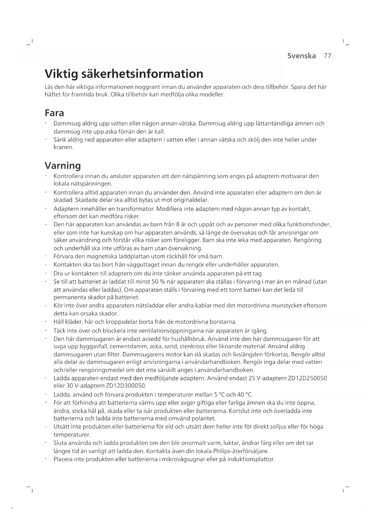 Svenska Viktig säkerhetsinformation Läs den här viktiga informationen noggrant innan du använder apparaten och dess tillbehör. Spara det här häftet för framtida bruk. Olika tillbehör kan medfölja olika modeller. Fara