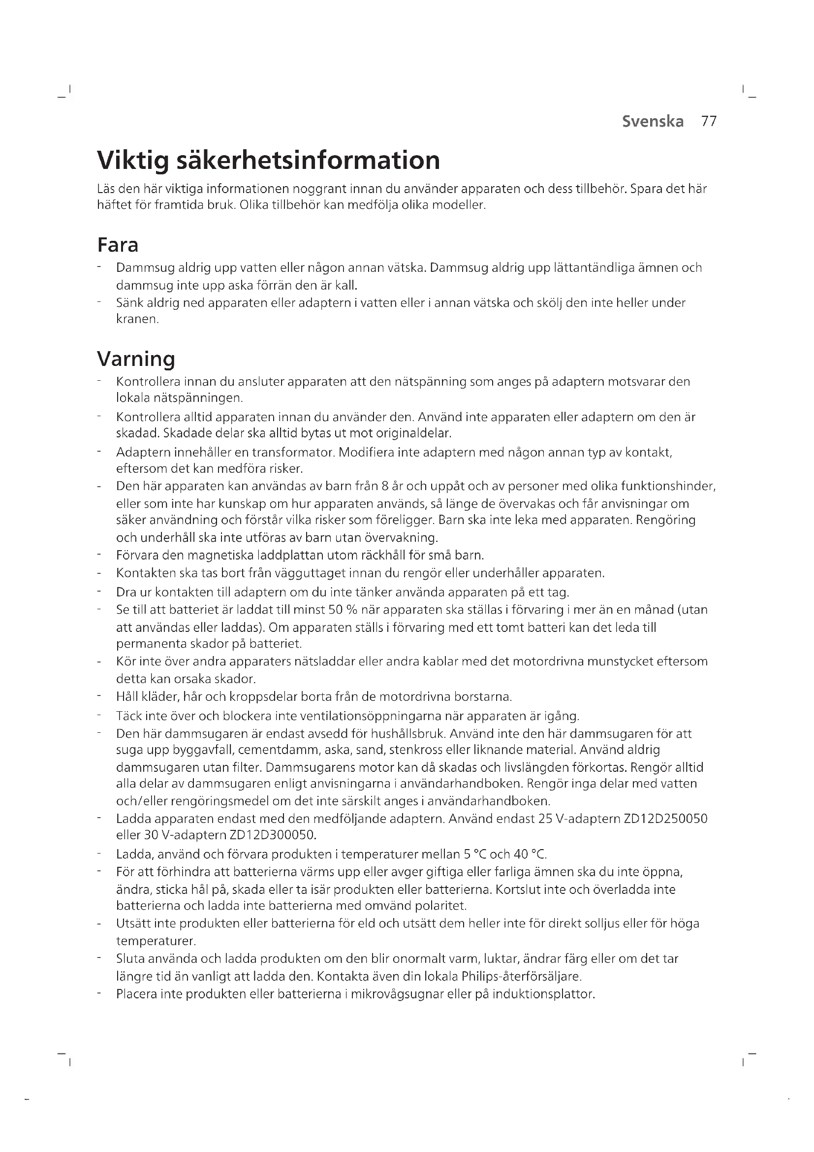 Svenska Viktig säkerhetsinformation Läs den här viktiga informationen noggrant innan du använder apparaten och dess tillbehör. Spara det här häftet för framtida bruk. Olika tillbehör kan medfölja olika modeller. Fara