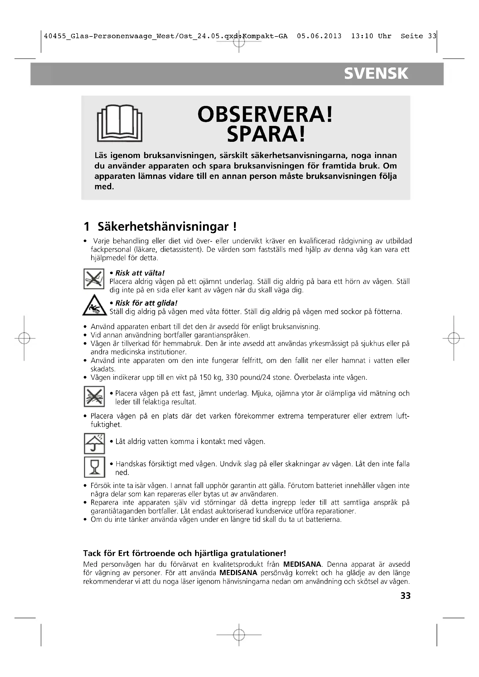 Försök inte ta isär vågen. I annat fall upphör garantin att gälla. Förutom batteriet innehåller vågen intenågra delar som kan repareras eller bytas ut av användaren. Reparera inte apparaten själv vid störningar då detta ingrepp leder till att samtliga anspråk pågarantiåtaganden bortfaller. Låt endast auktoriserad kundservice utföra reparationer. Om du inte tänker använda vågen under en längre tid skall du ta ut batterierna. Tack för Ert förtroende och hjärtliga gratulationer! Med personvågen har du förvärvat en kvalitetsprodukt från MEDISANA. Denna apparat är avsedd för vägning av personer. För att använda MEDISANA persönvåg korrekt och ha glädje av den länge rekommenderar vi att du noga läser igenom hänvisningarna nedan om användning och skötsel av vågen. 40455_Glas-Personenwaage_West/Ost_24.05.qxd:Kompakt-GA 05.06.2013 13:10 Uhr Seite 3334 SVENSK