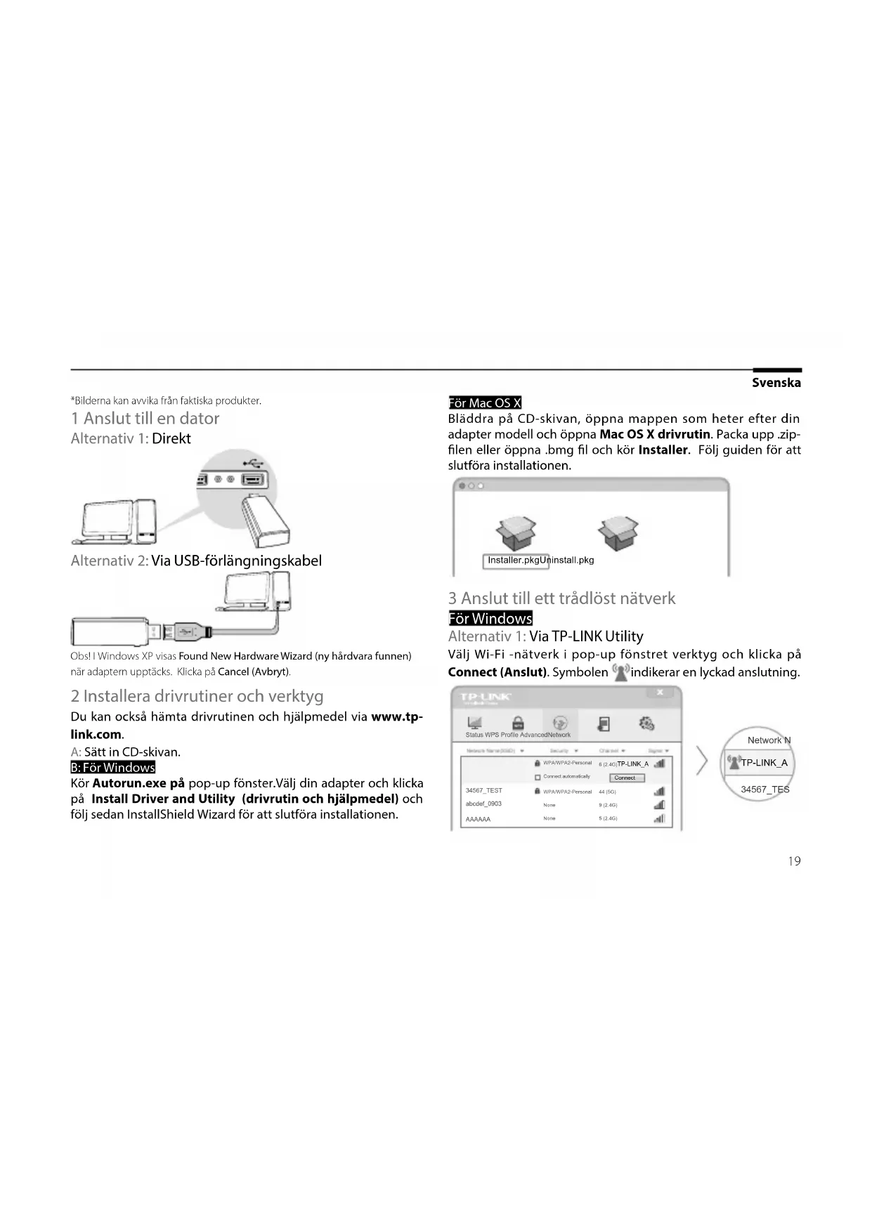 PBC PIN WPS Progress : Scan Active WPS AP 28 sec Cancel TP-LINK Wireless Configuration Utility C: Wanneer u gezegd wordt " WPS Protocol Finished", klik op OK. Opmerking: Wanneer u niets gevraagd wordt, controleer dan de adapter's LED. Wanneer deze solide gaat branden, is de adapter succesvol met het netwerk verbonden via WPS. De verbindings status kan bekeken worden op het Link Status scherm.19 Svenska *Bilderna kan avvika från faktiska produkter. 1 Anslut till en dator Alternativ 1: Direkt Alternativ 2: Via USB-förlängningskabel Obs! I Windows XP visas Found New Hardware Wizard (ny hårdvara funnen) när adaptern upptäcks. Klicka på Cancel (Avbryt). 2 Installera drivrutiner och verktyg Du kan också hämta drivrutinen och hjälpmedel via www.tp- link.com. A: Sätt in CD-skivan. B: För Windows Kör Autorun.exe på pop-up fönster.Välj din adapter och klicka på Install Driver and Utility (drivrutin och hjälpmedel) och följ sedan InstallShield Wizard för att slutföra installationen. För Mac OS X Bläddra på CD-skivan, öppna mappen som heter efter din adapter modell och öppna Mac OS X drivrutin. Packa upp .zip- len eller öppna .bmg l och kör Installer. Följ guiden för att slutföra installationen. Installer.pkg Uninstall.pkg 3 Anslut till ett trådlöst nätverk För Windows Alternativ 1: Via TP-LINK Utility Välj Wi-Fi -nätverk i pop-up fönstret verktyg och klicka på Connect (Anslut). Symbolen indikerar en lyckad anslutning. Status WPS Profile Advanced Network Name(SSID) Channel Signal Security 44 (5G)5 (2.4G)9 (2.4G) None WPA/WPA2-Personal None 34567_TESTabcdef_0903AAAAAA6 (2.4G)TP-LINK_AConnect automaticallyWPA/WPA2-PersonalConnect Network 34567_TEST Network Na TP-LINK_A20 Svenska Alternativ 2: Via Wi-Fi Protected Setup (WPS) Om ditt kort inte har en WPS-knapp, ignorerar du det här alternativet. A: Tryck på WPS-knappen på routern. B: Inom 2 minuter, håll på WPS-knappen på kortet tills visas följande skärm. Configuring the wireless network. Connecting to the network… WPS C: När du får uppmaningen "ansluten till nätverket av WPS", klicka på OK. Alternativ 3: Via Windows Wireless Utility Klicka på (ikonen Nätverk) i systemfältet, välj Wi-Fi -nätverk och klicka på Connect (anslut). Obs! I Windows XP, måste du stänga TP-LINK Utility innan du använder Windows Wireless Utility. För Mac OS X Alternativ 1: Via TP-LINK Utility A: Välj Available Network or Site Survey (tillgängligt nätverk eller Survey) i pop-up fönstret. B: Välj Wi-Fi -nätverk och klicka på Connect (Anslut). Status kan ses på Link Status. TP-LINK Wireless Configuration UtilityProlesLink Status Available Network WPS InformationAssociated SSID34567_TESTabcdef_0903AAAAAABSSID001018a95d8d0051e1022044021018010002Network TypeInfrastructureInfrastructureInfrastructureEncryptionWPA2-PSK AESNo EncryptionNo EncryptionChannel