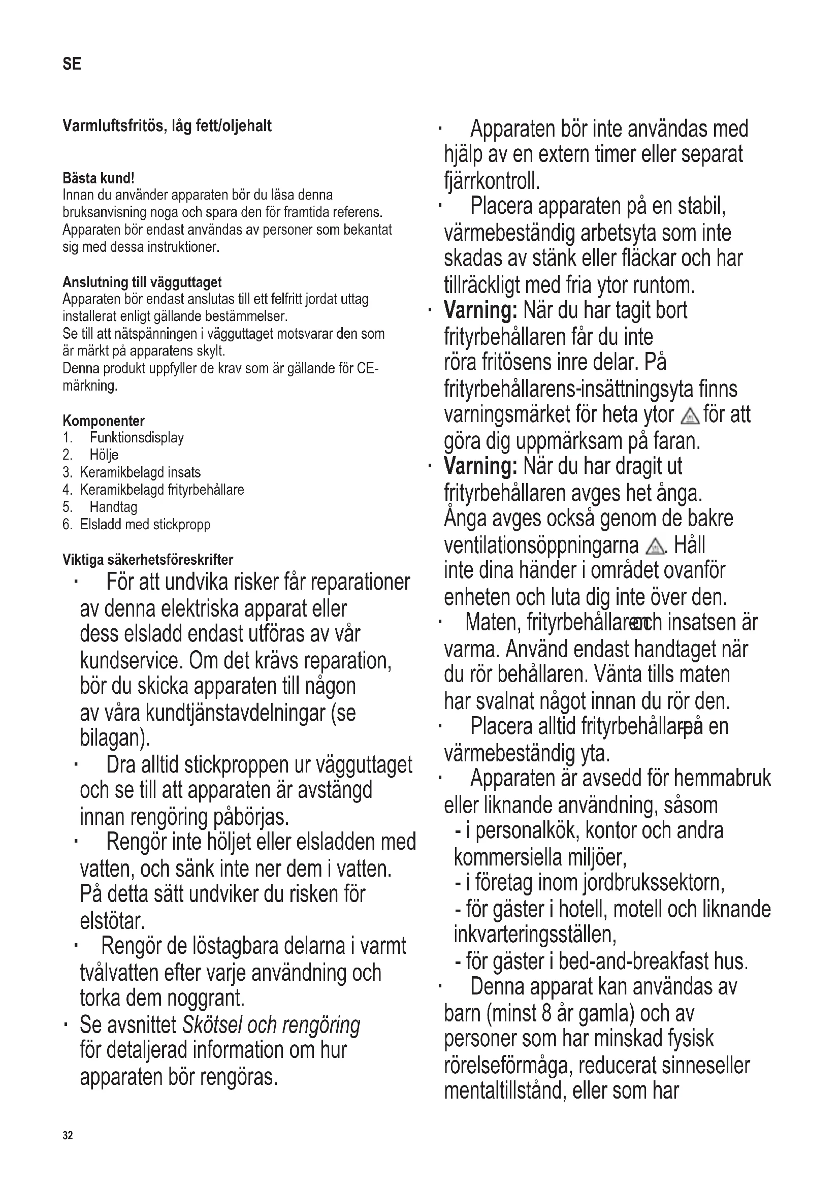 Viktiga säkerhetsföreskrifter ∙ För att undvika risker får reparationer av denna elektriska apparat eller dess elsladd endast utföras av vår kundservice. Om det krävs reparation, bör du skicka apparaten till någon av våra kundtjänstavdelningar (se bilagan). ∙ Dra alltid stickproppen ur vägguttaget och se till att apparaten är avstängd innan rengöring påbörjas. ∙ Rengör inte höljet eller elsladden med vatten, och sänk inte ner dem i vatten. På detta sätt undviker du risken för elstötar. ∙ Rengör de löstagbara delarna i varmt tvålvatten efter varje användning och torka dem noggrant. ∙ Se avsnittet Skötsel och rengöring för detaljerad information om hur apparaten bör rengöras. ∙ Apparaten bör inte användas med hjälp av en extern timer eller separat fjärrkontroll. ∙ Placera apparaten på en stabil, värmebeständig arbetsyta som inte skadas av stänk eller äckar och har tillräckligt med fria ytor runtom. ∙ Varning: När du har tagit bort frityrbehållaren får du inte röra fritösens inre delar. På frityrbehållarens insättningsyta nns varningsmärket för heta ytor för att göra dig uppmärksam på faran. ∙ Varning: När du har dragit ut frityrbehållaren avges het ånga. Ånga avges också genom de bakre ventilationsöppningarna . Håll inte dina händer i området ovanför enheten och luta dig inte över den. ∙ Maten, frityrbehållaren och insatsen är varma. Använd endast handtaget när du rör behållaren. Vänta tills maten har svalnat något innan du rör den. ∙ Placera alltid frityrbehållaren på en värmebeständig yta. ∙ Apparaten är avsedd för hemmabruk eller liknande användning, såsom - i personalkök, kontor och andra kommersiella miljöer, - i företag inom jordbrukssektorn, - för gäster i hotell, motell och liknande inkvarteringsställen, - för gäster i bed-and-breakfast hus. ∙ Denna apparat kan användas av barn (minst 8 år gamla) och av personer som har minskad fysisk rörelseförmåga, reducerat sinneseller mentaltillstånd, eller som har SE33 142 x 208 mm bristfällig erfarenhet och kunskap, förutsatt att dessa personer är under uppsyn eller har fått tillräckliga instruktioner beträffande apparatens användning och vet vilka risker och säkerhetsåtgärder som användningen innefattar. ∙ Barn bör inte tillåtas rengöra eller göra service på apparaten ifall de inte är övervakade och minst 8 år gamla. ∙ Barn bör inte tillåtas leka med apparaten. ∙ Apparaten och dess elsladd bör hållas utom räckhåll för barn under 8 år. ∙ Varning: Håll barn på avstånd från apparatens förpackningsmaterial eftersom fara eventuellt kan uppstå. Det nns t.ex. risk för kvävning. ∙ Lämna aldrig grytan utan tillsyn medan den är i användning. ∙ Starta inte fritösen utan att ha installerat insatsen i frityrbehållaren. ∙ Innan varje användning bör apparaten samt dess elsladd och monterade tillbehör inspekteras noga så att de inte har några skador. Om apparaten t ex har tappats på en hård yta, eller om elsladden har utsatts för alltför hård kraft, bör den inte längre användas: Även osynliga skador kan försämra apparatens driftsäkerhet. I detta fall ber vi dig vänligen kontakta vår kundservice. ∙ Ställ inte apparaten under väggskåp eller hängande föremål, direkt intill en vägg eller i ett hörn. ∙ Se till att det inte nns lättantändliga material i närheten. ∙ Varning: Täck inte över ventilationsöppningarna. ∙ Varning: Låt inte apparaten eller elsladden komma i kontakt med heta ytor eller heta källor. Låt inte elsladden hänga fritt; sladden måste hållas på säkert avstånd från apparatens heta delar. ∙ Låt apparaten svalna tillräckligt innan du yttar på den. ∙ Dra alltid stickproppen ur vägguttaget - efter användning, - ifall apparaten skulle krångla, - innan apparaten rengörs. ∙ Ta stickproppen ur vägguttaget genom att dra i stickproppen, aldrig i sladden. ∙ För att undvika repor på beläggningen, använd inte köksredskap av metall när du fyller på eller tar ur livsmedlet. ∙ Inget ansvar godtas om skada uppkommer till följd av felaktig användning, eller om dessa instruktioner inte följts. Korrekt användning ∙ Denna apparat kan enbart användas för matlagning. Annan användning anses som felaktig och kan leda till personskador eller materiella skador. ∙ I motsats till konventionella fritöser så är denna apparat inte ämnad för användning med olja eller fett. Innan du startar apparaten för första gången ∙ Innan du tar apparaten i bruk första gången bör du ta bort kvarvarande förpackningsmaterial och reklamklistermärken. ∙ Värm upp apparaten i 15 minuter till 200 °C utan mat. Detta minskar den typiska lukt som uppstår när apparaten tas i bruk. ∙ Se till att vädra ordentligt genom att öppna fönster eller balkongdörrar. ∙ Rengör apparaten efteråt enligt beskrivningen i avsnittet Skötsel och rengöring. Funktionsdisplay Display - Tillagning/Hetluft Display - Temperatur Display - Återstående funktionstid Väljare - Temperatur/Tidsökning/-minskning Väljare - On/Off & Start/Stopp Väljare - Temperatur/Tid Förberedning av enheten