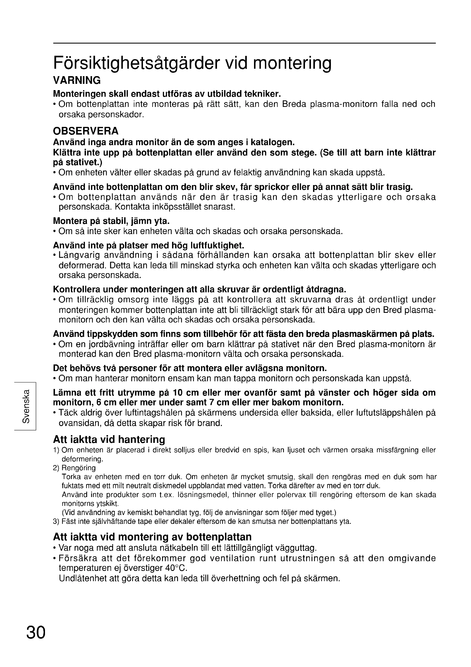 - Om bottenplattan inte monteras på rätt sätt, kan den Breda plasma-monitorn falla ned och orsaka personskador. OBSERVERA Använd inga andra monitor än de som anges i katalogen. Klättra inte upp på bottenplattan eller använd den som stege. (Se till att barn inte klättrar på stativet.)