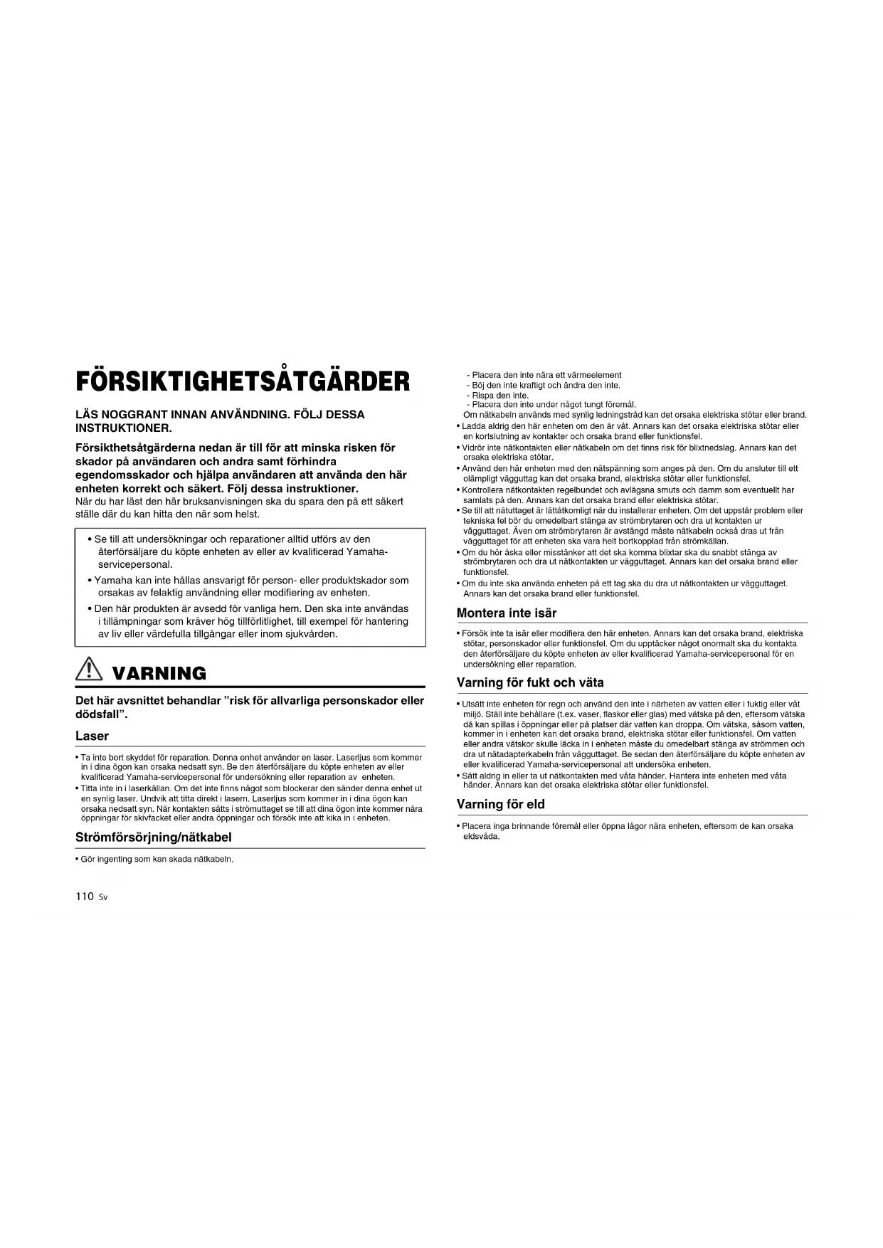 LÄS NOGGRANT INNAN ANVÄNDNING. FÖLJ DESSA INSTRUKTIONER. Försikthetsåtgärderna nedan är till för att minska risken för skador på användaren och andra samt förhindra egendomsskador och hjälpa användaren att använda den här enheten korrekt och säkert. Följ dessa instruktioner. När du har läst den här bruksanvisningen ska du spara den på ett säkert ställe där du kan hitta den när som helst. VARNING Det här avsnittet behandlar ”risk för allvarliga personskador eller dödsfall”. Laser