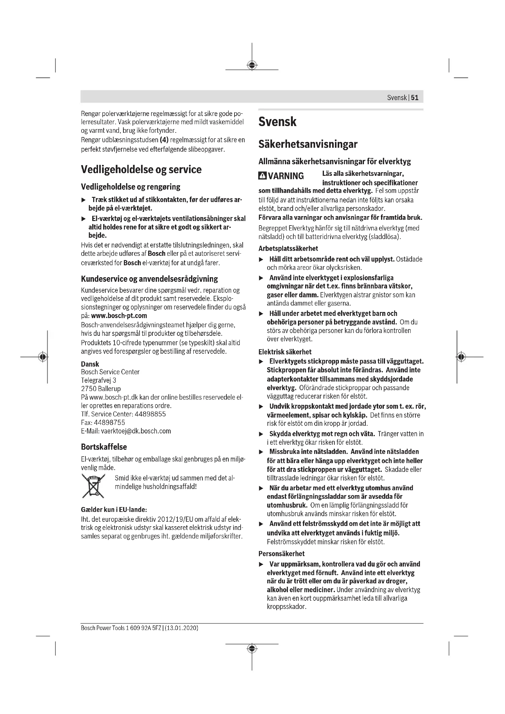7,0 1,5 7,5 1,5 Bosch Power Tools 1 609 92A 5FZ | (13.01.2020)54 | Svensk Den vibrationsnivå och det bullervärde som anges i dessa anvisningar har uppmätts enligt en mätmetod som normerats och kan användas för att jämföra elverktyg med varandra. Mätmetoden är även lämplig för preliminär bedömning av vibrations- och bullernivån. Den angivna vibrations- och bullernivån representerar den huvudsakliga användningen av elverktyget. Om däremot elverktyget används för andra ändamål, med andra insatsverktyg eller inte underhållits ordentligt kan vibrations- och bullernivån avvika. Då kan vibrations- och bullernivån under arbetsperioden öka betydligt under hela arbetstiden. För en exakt bedömning av vibrations- och bullernivån bör även de tider beaktas när elverktyget är avstängt eller är igång, men inte används. Detta reducerar vibrations- och bullerbelastningen för den totala arbetsperioden betydligt. Bestäm extra säkerhetsåtgärder för att skydda operatören mot vibrationernas inverkan t.ex.: underhåll av elverktyget och insatsverktygen, att hålla händerna varma, organisation av arbetsförloppen. Montage u Dra stickproppen ur nätuttaget innan arbeten utförs på elverktyget. Byta slipblad För att ta av slipplattan (8), lyft den i sidan och dra av den från sliprondellen (11). Ta bort smuts och damm från sliprondellen (11), t. ex. med en pensel, innan du sätter på ett nytt slipblad. Sliprondellens (11) yta består av ett kardborrfäste så att slipbladen kan fästas enkelt och snabbt. Tryck slipbladet (8) fast på undersidan av sliprondellen (11). För en optimal dammutsugning, se till att utstansningarna i slipbladet(8) stämmer överens med hålen på sliprondellen(11). Val av sliprondell Elverktyget kan utrustas med sliprondeller i olika hårdlek beroende på användning: – Extra mjuk sliprondell: lämplig för polering och tät slipning, även på välvda ytor – Sliprondell mjuk: lämplig för alla sliparbeten, universal – Sliprondell hård: lämplig för hög slipavverkning på jämna ytor Byta ut sliprondellen Anmärkning: Byt omedelbart ut skadade sliptallrikar (11). Dra av slipbladet resp. poleringsverktyget. Skruva ut skruven (10) helt och hållet och ta av sliptallriken (11). Sätt på den nya sliprondellen (11) och dra åt skruven för hand. Observera: medbringarna är olika för Ø150-plattor och Ø125-plattor. Plattorna kan endast monteras på passande elverktyg. Anmärkning: Kontrollera vid påsättning av sliptallriken att medbringarens kuggning griper tag i sliptallrikens urtagningar. Anmärkning: En skadad sliptallrik får bara bytas av en auktoriserad kundtjänst för Bosch elverktyg. Damm-/spånutsugning Dammet från material som t.ex. blyhaltig målning, vissa träslag, mineraler och metall kan vara hälsovådligt. Beröring eller inandning av dammet kan orsaka allergiska reaktioner och/eller andningsbesvär hos användaren eller personer som uppehåller sig i närheten. Vissa damm från ek eller bok anses vara cancerogena, speciellt då i förbindelse med tillsatsämnen för träbehandling (kromat, träkonserveringsmedel). Endast yrkesmän får bearbeta asbesthaltigt material. – Använd om möjligt en för materialet lämplig dammutsugning. – Se till att arbetsplatsen är väl ventilerad. – Vi rekommenderar ett andningsskydd i filterklass P2. Beakta de föreskrifter som i aktuellt land gäller för bearbetat material. u Undvik dammanhopning på arbetsplatsen. Damm kan lätt självantändas. Vid slipning rekommenderas anslutning av elverktyget till en dammsugare. Elverktyget har inget eget utblås; dammpåsar kan inte användas. Extern utsugning Anslut utsugsslangen (tillbehör) till utblåsröret (3) eller direkt på utblåsstutsen (4) på elverktyget. Observera: utblåsröret(3) består av antistatiskt material. Vid användning av en antistatisk utsugsslang (tillbehör) förhindras en elektrostatisk urladdning av apparaten som i sällsynta fall kan uppstå vid slipning. Du kan ta av utblåsröret (3) vid arbete utan dammutsug (t.ex. polering). Tryck på upplåsningsknappen (15) och dra utblåsröret (3) bakåt fram elverktyget. Sugen måste vara lämplig för det material som ska bearbetas. Använd en specialsug för att suga hälsovådligt och cancerframkallande eller torrt damm. Tilläggshandtag Tilläggshandtaget (5) möjliggör en bekväm hantering och optimal kraftfördelning, framför allt vid hög materialnedtagning vid slipning. Fäst stödhandtaget (5) till höger eller vänster på kåpan i gängan (13). För bättre kontroll av elverktyget rekommenderar vi att du lägger en andra hand på det främre handtaget vid slipning. Stödhandtaget (5) kan utöva sidokrafter som kan göra att elverktyget börjar vackla. Detta kan skada plattan och ytan som ska slipas. 1 609 92A 5FZ | (13.01.2020) Bosch Power ToolsSvensk | 55 Kantskydd Kantskyddet (12) skyddar sliprondellen vid slipning av kantnära områden. Sätt kantskyddet (12) framifrån på elverktyget. För att ta av det, dra kantskyddet (12) framåt i änden. Drift Driftstart u Beakta nätspänningen! Kontrollera att strömkällans spänning överensstämmer med uppgifterna på elverktygets typskylt. Elverktyg märkta med 230V kan även anslutas till 220V. In- och urkoppling u Se till att du kan manövrera på-/av-strömbrytaren utan att släppa handtaget. För att slå på elverktyget, skjut på-/av-strömbrytare (2) framåt. För att stänga av elverktyget, skjut på-/av-strömbrytare (2) bakåt. Förval av svängningstal Med inställningshjulet svängningsförval (1) kan du förvälja svängningstalet och ändra det under driften. 1 – 2 lågt svängningstal 3 – 4 medelhögt svängningstal 5 – 6 högt svängningstal Lämpligt svängningstal beror på material och arbetsförhållande. Prova fram den bästa inställningen genom praktiska försök. Konstantelektroniken håller svängningstalet på tomgång och belastningen nästan konstant och säk