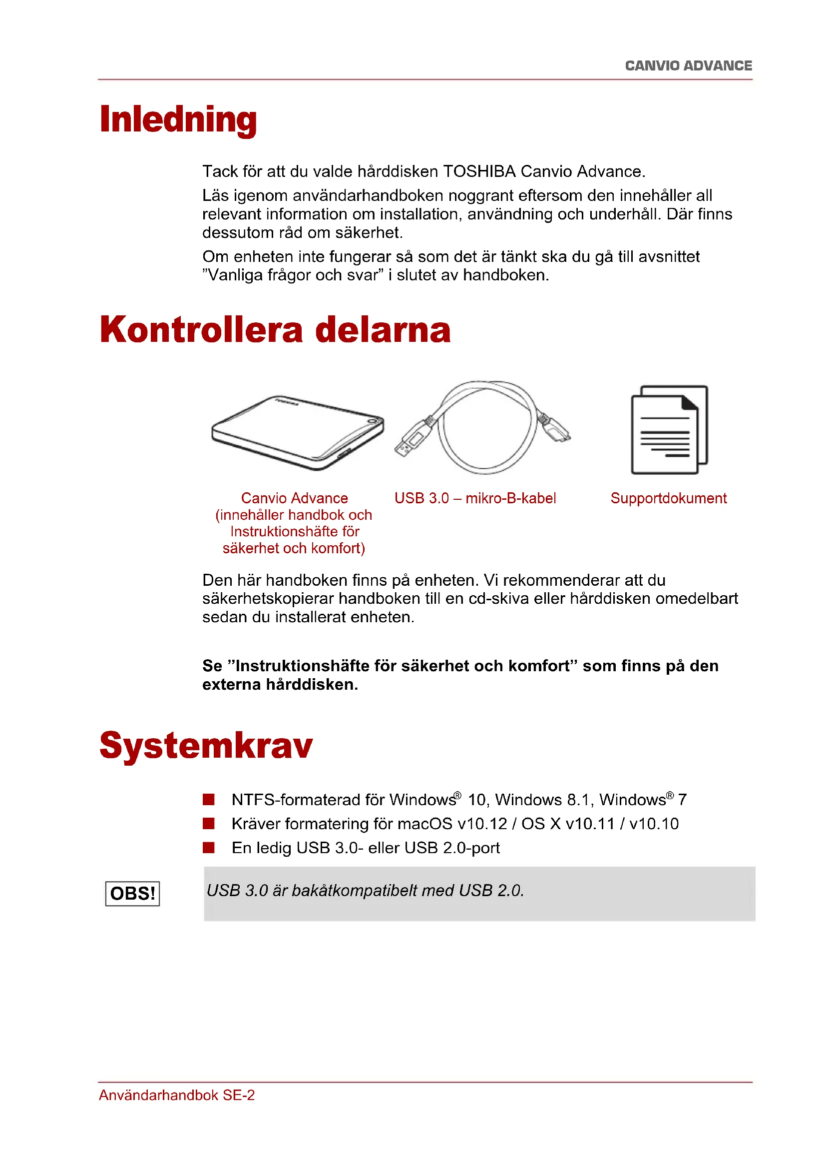 - Bestämmelser Användarhandbok SE-2 CANVIO ADVANCE Inledning Tack för att du valde hårddisken TOSHIBA Canvio Advance. Läs igenom användarhandboken noggrant eftersom den innehåller all relevant information om installation, användning och underhåll. Där finns dessutom råd om säkerhet. Om enheten inte fungerar så som det är tänkt ska du gå till avsnittet ”Vanliga frågor och svar” i slutet av handboken. Kontrollera delarna Den här handboken finns på enheten. Vi rekommenderar att du säkerhetskopierar handboken till en cd-skiva eller hårddisken omedelbart sedan du installerat enheten. Se ”Instruktionshäfte för säkerhet och komfort” som finns på den externa hårddisken. Systemkrav ■ NTFS-formaterad för Windows p. 7