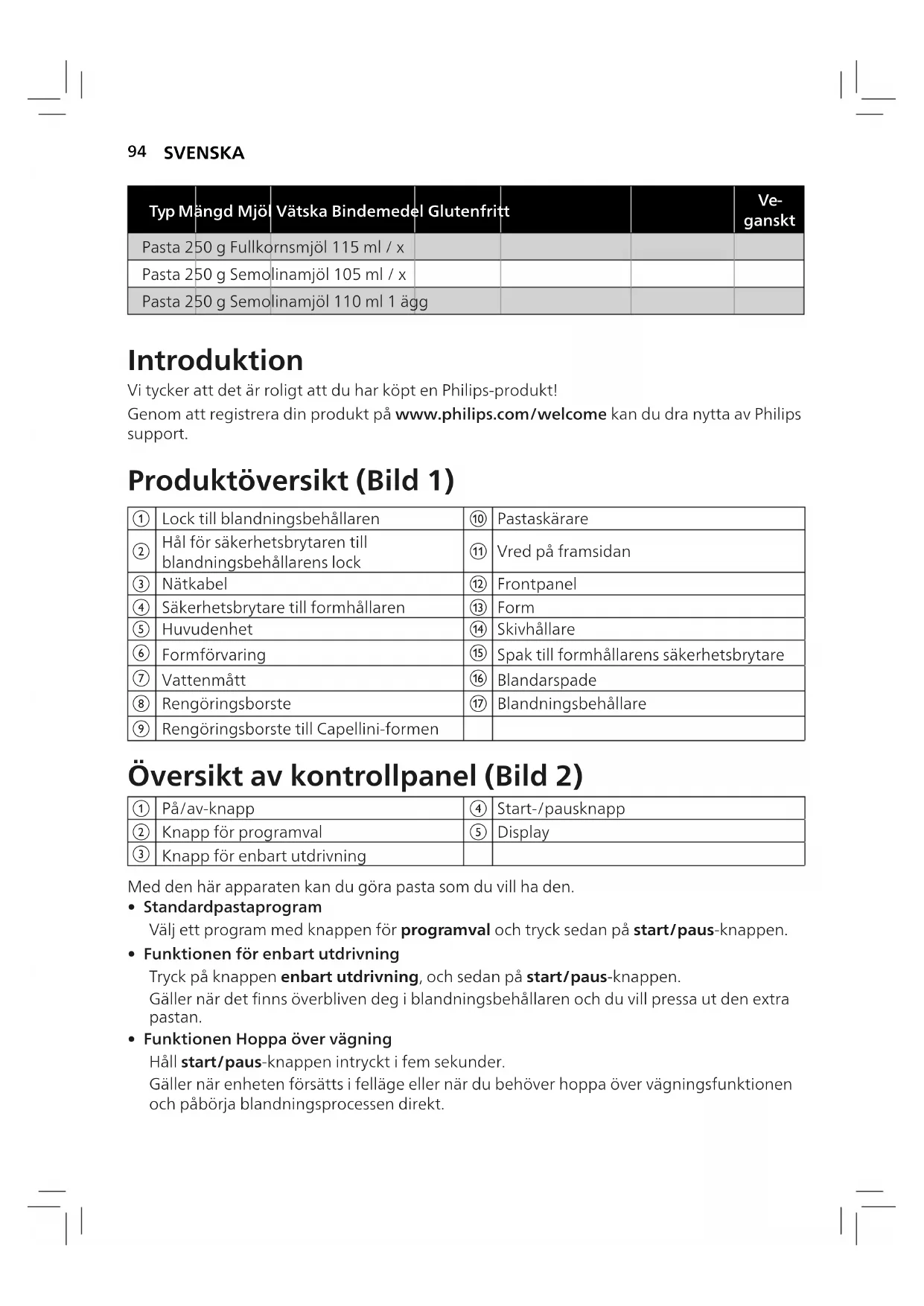 - Rödbetspasta/ rödbetsnudlar 4 Ta bort locket till blandningsbehållaren. (Bild3) 5 Vänta tills 0:00 visas på skärmen. (Bild18) 6 Häll mjölet i behållaren. (Bild19) Obs! y Apparaten väger och visar mängden mjöl automatiskt. Vikten blinkar tills du benner dig inom rätt intervall. (Bild20) y Lägg inte i mindre än 200g eller mer än 600g mjöl i behållaren. y För en del recept (till exempel småkakor och glutenfri pasta) måste du hoppa över vägningsdelen. I de här fallen håller du start/paus-knappen intryckt i fem sekunder så börjar apparaten blanda och mata ut direkt. 7 Stäng locket till behållaren. (Bild21) Obs! y Om du trycker på en knapp utan att stänga locket visas indikatorn för att stänga behållaren. (Bild22) y För in sidan med de två hakarna i apparaten först och skjut sedan locket mot huvudenheten. y Apparaten startar inte om locket inte är ordentligt stängt. Om du öppnar locket till behållaren när du tillverkar pastan stannar apparaten. Sätt fast locket och tryck på start/paus-knappen för att starta igen. 8 När locket är stängt visas den mängd vätska som behövs. (Bild23) 9 Använd det medföljande vattenmåttet för att mäta mängden vätska enligt vad som anges på displayen. (Bild24) Obs! y Mät upp vätskevolymen i ögonhöjd på en plan yta. y När du gör äggblandningen ska du knäcka ägget i vattenmåttet. Häll i vatten upp till den mängd som behövs och vispa sedan ihop vatten och ägg. y Två ägg kan användas i stället för ett, men se då till att den totala mängden vätska som föreslås inte överskrids. y För bättre noggrannhet ska du använda en köksvåg för att mäta vätskan.97 SVENSKA Starta pastaprogrammet 1 Tryck på start/paus-knappen för att påbörja blandningen. Timern startar då. (Bild25) 2 När blandningen startat häller du långsamt i vätskan längs hela öppningen i locket. (Bild26) Obs! Tillsätt inga andra ingredienser när du hällt i vätskan medan degen blandas. Om du gör det kommer pastans konsistens att påverkas. 3 När pastamaskinen har blandat klart piper den en gång och börjar pressa ut pasta efter några sekunder. Använd pastaskäraren för att skära pastan i den längd du vill ha. (Bild27) Obs! Om du inte använder rätt proportioner mellan vätska och mjöl kommer pastan inte att kunna pressas ut. Fler recept nns i kapitlet Recept. 4 Om du ser att det nns deg kvar i behållaren när pastan har matats ut kan du trycka på knappen för enbart utdrivning först och sedan på start/paus-knappen så pressas den överblivna pastan ut. (Bild28) Obs! y Den extra utdrivningen varar i tre minuter. y Pastans tillagningstid varierar beroende på personliga preferenser, pastatyp och antalet portioner. y Under pastaprocessen och när processen är klar avger apparaten ett ljud. Viktigt! Pastarecepten som nns i kapitlet Recept är testade. Om du experimenterar med de medföljande recepten eller använder andra pastarecept måste proportionerna mellan mjöl, vatten och ägg justeras. Pastamaskinen kommer inte att fungera korrekt om du inte justerar de nya recepten. Obs! y För att få bra resultat är de viktigt att degen ser smulig ut i knådningsbehållaren. Om degen ser smulig ut kommer receptet att fungera. Receptet kommer inte att fungera om degen är för våt (ser ut som vanlig degkonsistens) eller för torr (när det ser ut som om degen består endast av mjöl). y Skillnad i ingrediensernas kvalitet beroende på säsong och ursprungsregion kan påverka proportionerna mellan mjöl och vatten. Du kan justera den utifrån de rekommenderade proportionerna. y När du gör glutenfri pasta eller bönpasta behövs mindre vatten än den rekommenderade mängden. Du kan använda cirka 10–20ml mindre vätska för de här recepten. Justera mängden vätska beroende på typ av mjöl. y ”Gluten” är ett bindemedel som gör att pastan inte går sönder så lätt. Glutenfritt mjöl innehåller inte något bindemedel. Därför behövs ett förtjockningsmedel som fungerar som ett ”bindemedel”, t.ex. ägg eller xantangummi. Olika typer av glutenfritt mjöl fungerar på olika sätt när du gör pasta. Vissa mjöltyper är inte lämpliga för att göra pasta, till exempel kokosmjöl, andra mjölsorter fungerar bra, till exempel quinoamjöl och bovetemjöl. y När du gör äggpasta eller grönsakspasta måste ägg eller grönsaksjuice vispas med vattnet till jämn konsistens innan du häller blandningen i behållaren via skåran i locket. Ingredienserna måste vara i ytande form när du tillsätter dem.98 SVENSKA Rengöring 1 Koppla loss kontakten från eluttaget. (Bild29) 2 Ta bort locket till blandningsbehållaren. (Bild3) 3 Lossa kontrollvreden på framsidan. (Bild4) Obs! Framsidan är tung. Var extra försiktig när du tar bort den. 4 Ta loss framsidan, formen, formhållaren, blandaren och blandningsbehållaren i den ordningen. (Bild5) 5 Använd en torr trasa för att ta bort mjölrester från huvudenheten. (Bild30) 6 Ta bort degrester från formen med det medföljande rengöringsverktyget. Därefter kan du rengöra med vatten. (Bild31) Obs! Låt formarna lufttorka i 2–4 timmar och använd sedan rengöringsverktyget till att peta ut degen ur hålen. 7 Rengör alla löstagbara delar och torka dem så att de är helt torra. (Bild6). 8 Använd en torr trasa för att rengöra kontrollpanelen och pastamaskinens utsida. (Bild32) Förvaring 1 Dra ur nätsladden och låt apparaten svalna. (Bild 29) Obs! Se till att alla delar är rena och torra innan de läggs undan. 2 Du kan förvara formarna i förvaringslådan. (Bild33) Obs! Placera de tjockare formarna i facken med ikonerna och , och placera de tunnare formarna i facken med ikonen . (Bild 34)99 SVENSKA Felsökning I det här kapitlet sammanfattas de vanligaste problemen som du kan råka ut för med apparaten. Om du inte kan lösa problemet med hjälp av informationen nedan kan du gå till www.philips.com/support där det nns en lista med van
