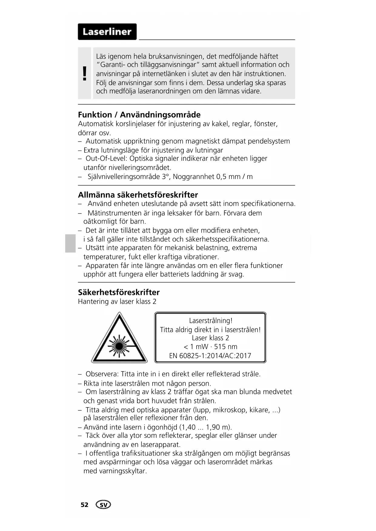 Indicações sobre manutenção e conservação Limpe todos os componentes com um pano levemente húmido e evite usar produtos de limpeza, produtos abrasivos e solventes. Remova a/s pilha/s antes de um armazenamento prolongado. Armazene o aparelho num lugar limpo e seco.52 Funktion / Användningsområde Automatisk korslinjelaser för injustering av kakel, reglar, fönster, dörrar osv. – Automatisk uppriktning genom magnetiskt dämpat pendelsystem – Extra lutningsläge för injustering av lutningar – Out-Of-Level: Optiska signaler indikerar när enheten ligger utanför nivelleringsområdet. – Självnivelleringsområde 3°, Noggrannhet 0,5 mm / m – Observera: Titta inte in i en direkt eller reekterad stråle. – Rikta inte laserstrålen mot någon person. – Om laserstrålning av klass 2 träffar ögat ska man blunda medvetet och genast vrida bort huvudet från strålen. – Titta aldrig med optiska apparater (lupp, mikroskop, kikare, ...) på laserstrålen eller reexioner från den. – Använd inte lasern i ögonhöjd (1,40 ... 1,90 m). – Täck över alla ytor som reekterar, speglar eller glänser under användning av en laserapparat. – I offentliga traksituationer ska strålgången om möjligt begränsas med avspärrningar och lösa väggar och laserområdet märkas med varningsskyltar. Laserstrålning! Titta aldrig direkt in i laserstrålen! Laser klass 2 < 1 mW · 515 nm EN 60825-1:2014/AC:2017 Säkerhetsföreskrifter Hantering av laser klass 2 Allmänna säkerhetsföreskrifter – Använd enheten uteslutande på avsett sätt inom specikationerna. – Mätinstrumenten är inga leksaker för barn. Förvara dem oåtkomligt för barn. – Det är inte tillåtet att bygga om eller modiera enheten, i så fall gäller inte tillståndet och säkerhetsspecikationerna. – Utsätt inte apparaten för mekanisk belastning, extrema temperaturer, fukt eller kraftiga vibrationer. – Apparaten får inte längre användas om en eller era funktioner upphör att fungera eller batteriets laddning är svag. Läs igenom hela bruksanvisningen, det medföljande häftet “Garanti- och tilläggsanvisningar“ samt aktuell information och anvisningar på internetlänken i slutet av den här instruktionen. Följ de anvisningar som finns i dem. Dessa underlag ska sparas och medfölja laseranordningen om den lämnas vidare.