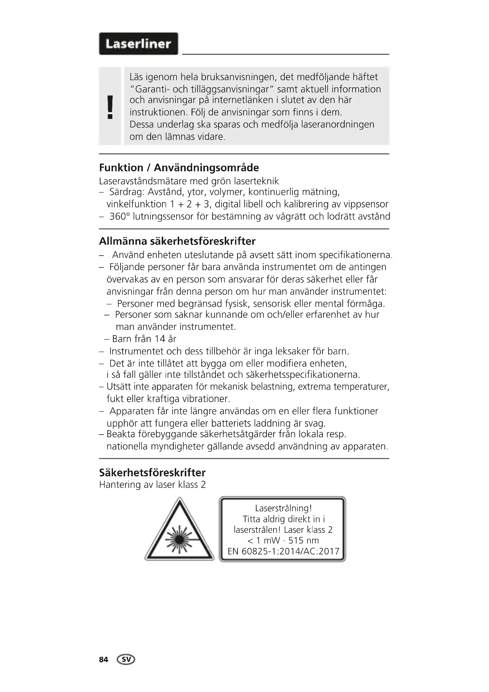 Säkerhetsföreskrifter Hantering av laser klass 2 Laserstrålning! Titta aldrig direkt in i laserstrålen! Laser klass 2 < 1 mW · 515 nm EN 60825-1:2014/AC:2017 Allmänna säkerhetsföreskrifter – Använd enheten uteslutande på avsett sätt inom specikationerna. – Följande personer får bara använda instrumentet om de antingen övervakas av en person som ansvarar för deras säkerhet eller får anvisningar från denna person om hur man använder instrumentet: – Personer med begränsad fysisk, sensorisk eller mental förmåga. – Personer som saknar kunnande om och/eller erfarenhet av hur man använder instrumentet. – Barn från 14 år – Instrumentet och dess tillbehör är inga leksaker för barn. – Det är inte tillåtet att bygga om eller modiera enheten, i så fall gäller inte tillståndet och säkerhetsspecikationerna.