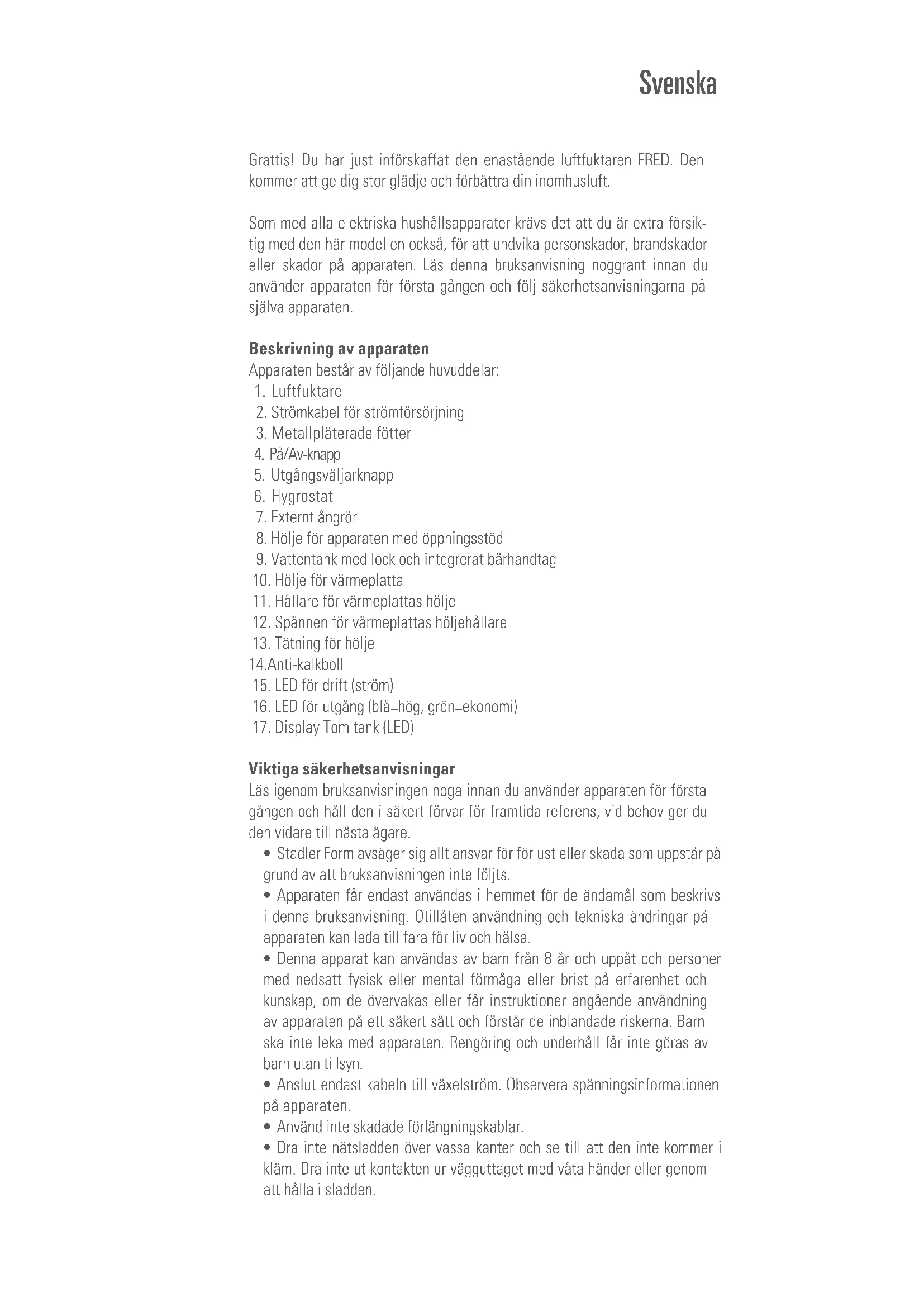 - Varning: het ånga! Du bör vara försiktig när du använder apparaten efter- som den släpper ut het vattenånga. Notera Använd inte luftfuktare Fred med urkalkat vatten från ett avkalkningssys- tem som använder jonbytar-principen (salt tillsätts till vattnet). Detta kan leda till funktionsstörningar och efterföljande läckage av apparaten. Förberedelser för användning / drift