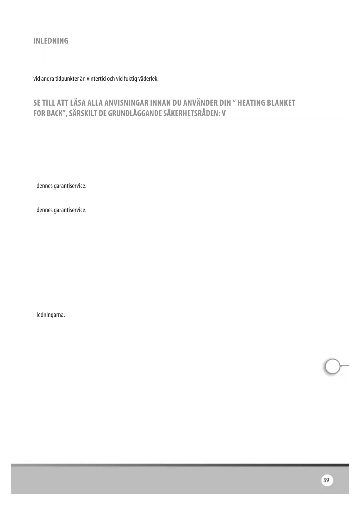 När du inte använder värmevästen och före rengöring, ska du iaktta följande anvisningar: - Se till att manöverkontrollen verkligen står i läge ”Off”. - Dra ur elkontakten. - Dra ut den kontakt som förbinder manöverkontrollen med värmevästen. - Låt värmevästen kallna innan du startar rengöringen. RENGÖRING Små fläckar kan tvättas bort med en trasa eller fuktig svamp och eventuellt med lite flytande tvättmedel avsett för ömtåliga textilier. Se upp! Man får inte kemtvätta värmevästen, inte vrida den, inte torka den i torktumlare eller torkskåp, inte mangla eller stryka den. Om värmevästen är mycket smutsig, kan den tvättas i tvättmaskin. Ställ in tvättmaskinen på ett tvättprogram för ömtåliga plagg på 30 °C. Använd tvättmedel för ömtåliga plagg och dosera enligt tvättmedelstillverkarens anvisningar. Rengör inte värmevästen för ofta. Då utsätts den för onödigt slitage. Värmevästen får tvättas i tvättmaskin högst fem gånger under sin livstid. När den ska torkas ska den inte hängas med klädnypor eller något annat. Utsätt inte värmevästen för värmekällor som till exempel solen, ett element eller annat. Anslut elsladden till värmevästen på nytt endast när kontakten och värmevästen är fullständigt torra. 40SV > Sätt under inga omständigheter på värmevästen för att torka den. Förvaring Om du inte använder värmevästen på länge bör du förvara den i originalförpackningen på ett torrt ställe. Ställ inga föremål på värmevästen.
