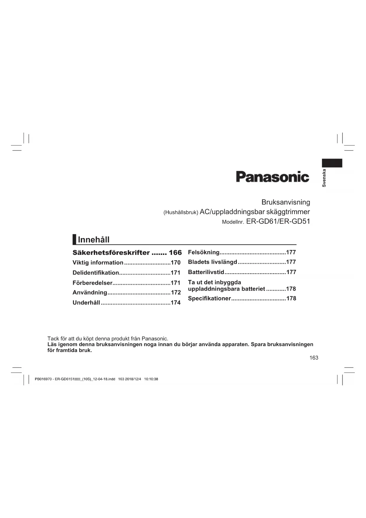 Kontakta läkare omedelbart. PB016970 - ER-GD6151_(10S)_12-04-18.indd 169 2018/12/4 10:10:40170 Svenska VARNING Efter att du tagit bort batteriet, förvara det inte inom räckhåll för barn och spädbarn. ‑ Batteriet orsakar skador på kroppen om du råkar svälja det.