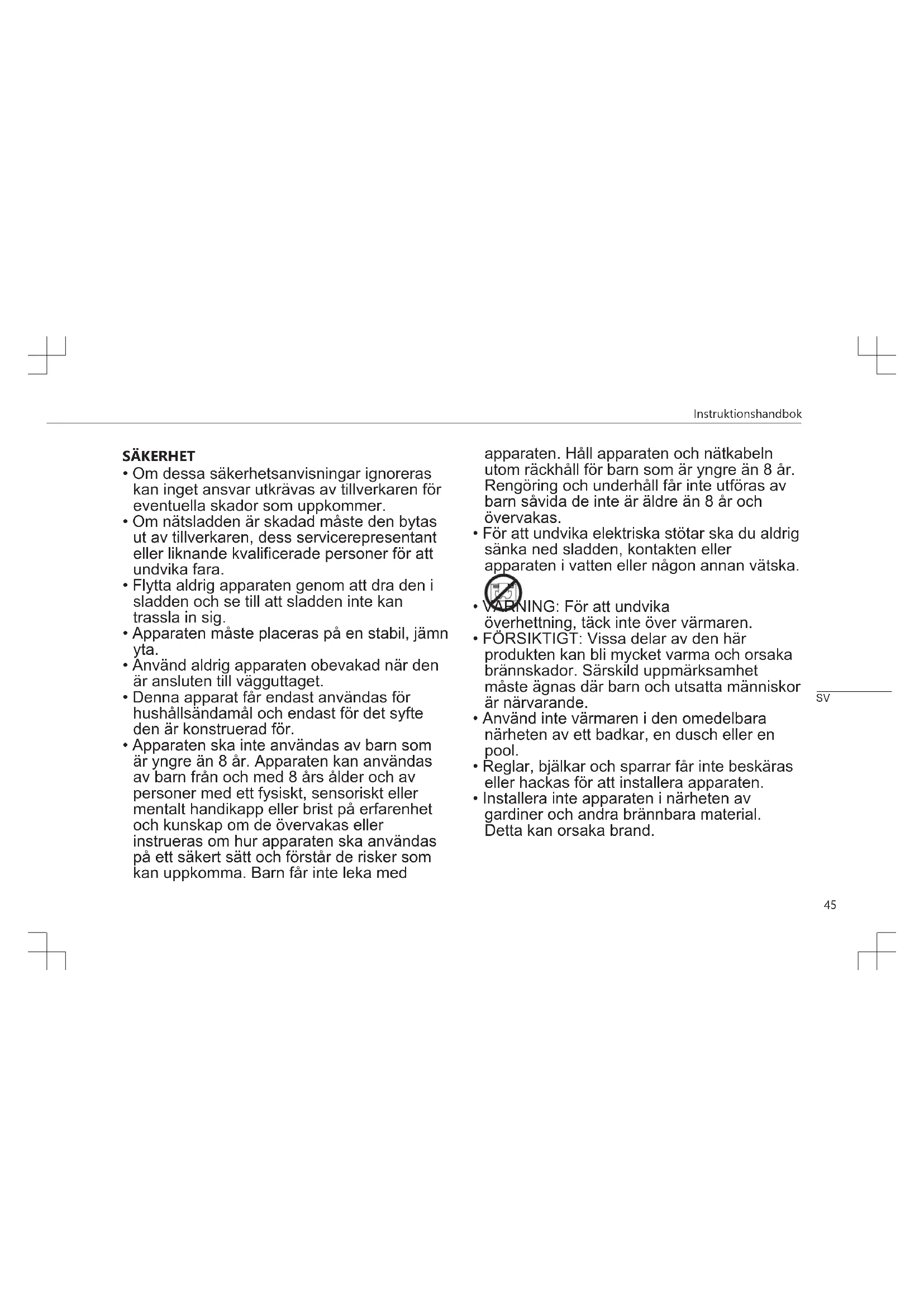 - VARNING! Använd inte värmaren i små rum med personer som inte kan lämna rummet av sig själva, om det inte sker under konstant övervakning.