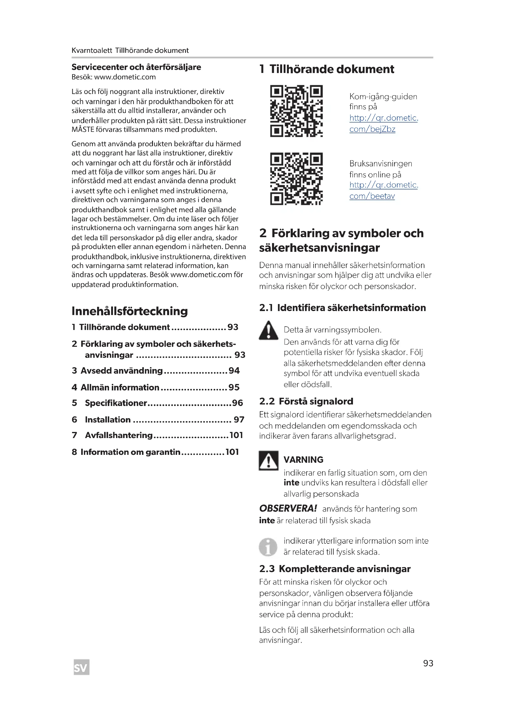 - 8 Information om garantin 1 Tillhörande dokument Kom-igång-guiden finns på http://qr.dometic. com/bejZbz Bruksanvisningen finns online på http://qr.dometic. com/beetav 2 Förklaring av symboler och säkerhetsanvisningar Denna manual innehåller säkerhetsinformation och anvisningar som hjälper dig att undvika eller minska risken för olyckor och personskador. p. 101