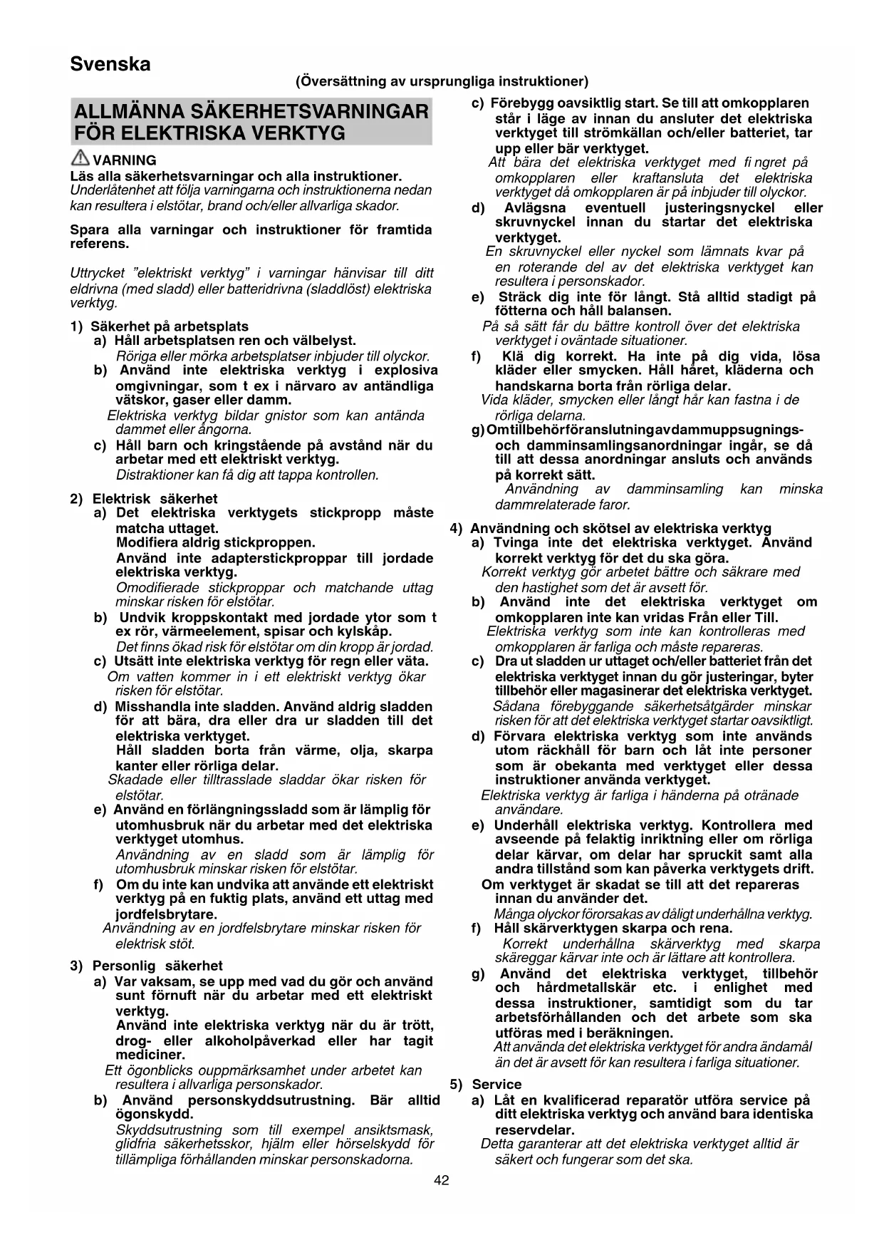 Vikt (Enligt EPTA-procedur 01/2003) Slå PÅ Slå AV Koppla bort strömkabelkontakten från eluttaget Varning Klass II verktyg STANDARDTILLBEHÖR Förutom huvudenheten (1 enhet) innehåller paketet tillbehören listade nedan. (1) Nyckel ...........................................................................1 (2) Sidohandtag .................................................................1 Standardtillbehören kan ändras utan föregående meddelande.