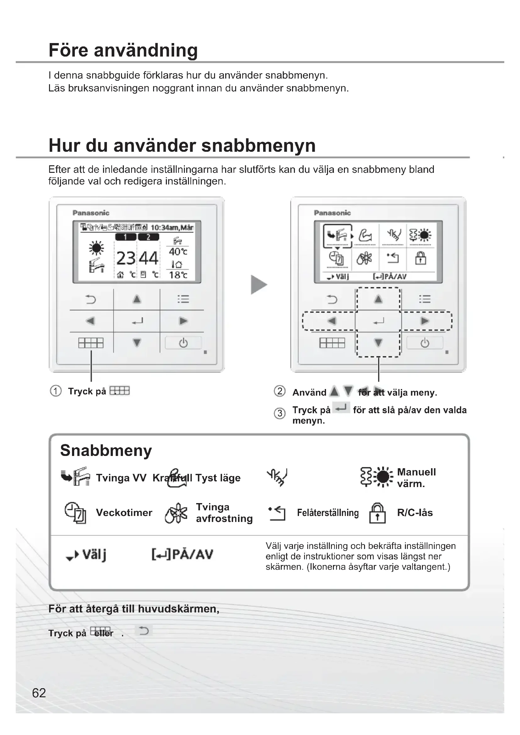 - “No” seçilirse ekran Ana Ekrana geri dönecektir. Uzaktan Kumanda kilidini açmak için Herhangi bir tuşa basın. (Mod kabul edildiğinde aşağıdaki ekran görüntülenecektir.) Herhangi bir 4 haneli sayı girin (sayı doğruysa ekran kilidi açılacaktır). Unutulan parolayı sıfırlamak için (çalışma OFF ekranı altında) , ve düğmelerine 5 saniye boyunca basın. (Mod kabul edildiğinde aşağıdaki ekran görüntülenecektir.) “Reset”i seçin. (Ekran 3 saniye sonra kapanacaktır.) U/K Kilidi62 I denna snabbguide förklaras hur du använder snabbmenyn. Läs bruksanvisningen noggrant innan du använder snabbmenyn. Före användning Hur du använder snabbmenyn Efter att de inledande inställningarna har slutförts kan du välja en snabbmeny bland följande val och redigera inställningen. Välj varje inställning och bekräfta inställningen enligt de instruktioner som visas längst ner skärmen. (Ikonerna åsyftar varje valtangent.) Snabbmeny För att återgå till huvudskärmen, Tryck på eller . Tvinga VV Kraftfull Tyst läge Manuell värm. Veckotimer Tvinga avfrostning Felåterställning R/C-lås