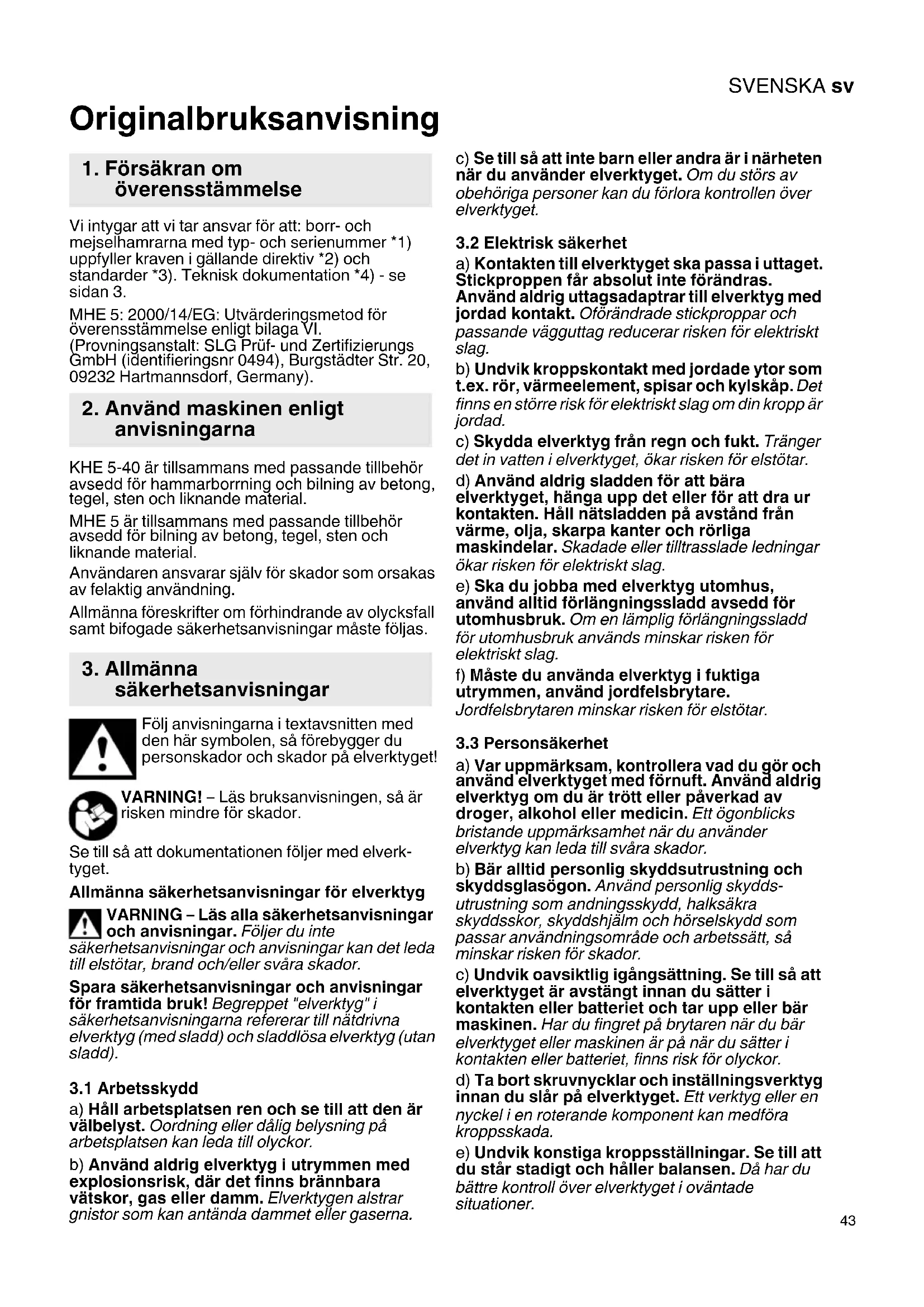 Originalbruksanvisning Vi intygar att vi tar ansvar för att: borr- och mejselhamrarna med typ- och serienummer *1) uppfyller kraven i gällande direktiv *2) och standarder *3). Teknisk dokumentation *4) - se sidan 3. MHE 5: 2000/14/EG: Utvärderingsmetod för överensstämmelse enligt bilaga VI. (Provningsanstalt: SLG Prüf- und Zertifizierungs GmbH (identifieringsnr 0494), Burgstädter Str. 20, 09232 Hartmannsdorf, Germany). KHE 5-40 är tillsammans med passande tillbehör avsedd för hammarborrning och bilning av betong, tegel, sten och liknande material. MHE 5 är tillsammans med passande tillbehör avsedd för bilning av betong, tegel, sten och liknande material. Användaren ansvarar själv för skador som orsakas av felaktig användning. Allmänna föreskrifter om förhindrande av olycksfall samt bifogade säkerhetsanvisningar måste följas. Följ anvisningarna i textavsnitten med den här symbolen, så förebygger du personskador och skador på elverktyget! VARNING! – Läs bruksanvisningen, så är risken mindre för skador. Se till så att dokumentationen följer med elverk- tyget. Allmänna säkerhetsanvisningar för elverktyg VARNING – Läs alla säkerhetsanvisningar och anvisningar. Följer du inte säkerhetsanvisningar och anvisningar kan det leda till elstötar, brand och/eller svåra skador. Spara säkerhetsanvisningar och anvisningar för framtida bruk! Begreppet "elverktyg" i säkerhetsanvisningarna refererar till nätdrivna elverktyg (med sladd) och sladdlösa elverktyg (utan sladd).
