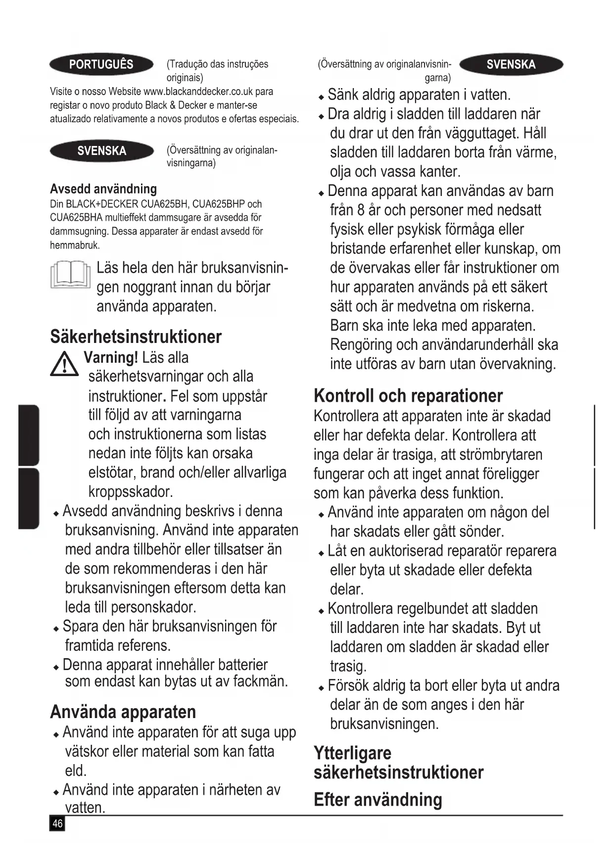 Spänning V 21.6 21.6 21.6 Watt-tim- mar Wh 54 54 54 Vikt Kg 4.35 4.35 4.35 Garanti Black & Decker är säker på kvaliteten hos denna produkt och erbjuder kunder 24 månaders garanti från inköpsdatumet. Garantin gäller utöver konsumentens rättigheter enligt lag och påverkar inte dessa. Garantin är giltig i de områden som tillhör medlemsstaterna i Europeiska unionen och det europeiska frihandelsområdet. För yrkande under garantin måste yrkandet vara in enlighet med Black & Deckers villkor och du kommer att behöva skicka in bevis på köpet till försäljaren eller en auktoriserad reparatör. Villkoren för Black & Deckers tvååriga garanti och var du hittar din närmaste auktoriserade reparatör kan erhållas på Internet på www.2helpU.com, eller genom att kontakta ditt lokal Black & Decker kontor på adressen som angetts i denna bruksanvisning. Besök vår webbplats www.blackanddecker.se för att registrera din nya Black & Decker-produkt samt för att få information om nya produkter och specialerbjudanden.51 (Oversettelse av de opprinnelige instruksjonene)NORSK Tiltenkt bruk BLACK+DECKER CUA625BH, CUA625BHP og CUA625BHA multistrøm støvsugere er designet for støvsuging. Disse apparatene er bare beregnet for bruk i hjemmet. Les hele denne håndboken nøye før du bruker apparatet. Sikkerhetsinstruksjoner
