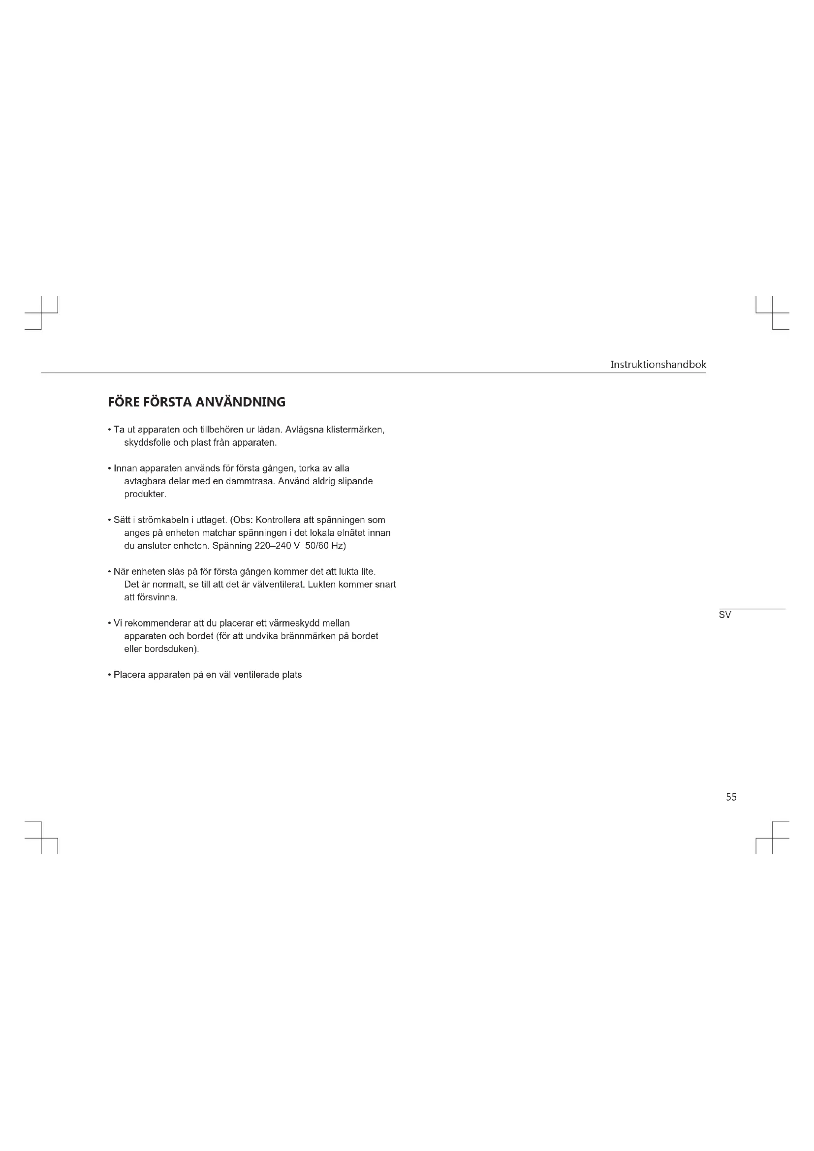 - Innan apparaten används för första gången, torka av alla avtagbara delar med en dammtrasa. Använd aldrig slipande produkter.