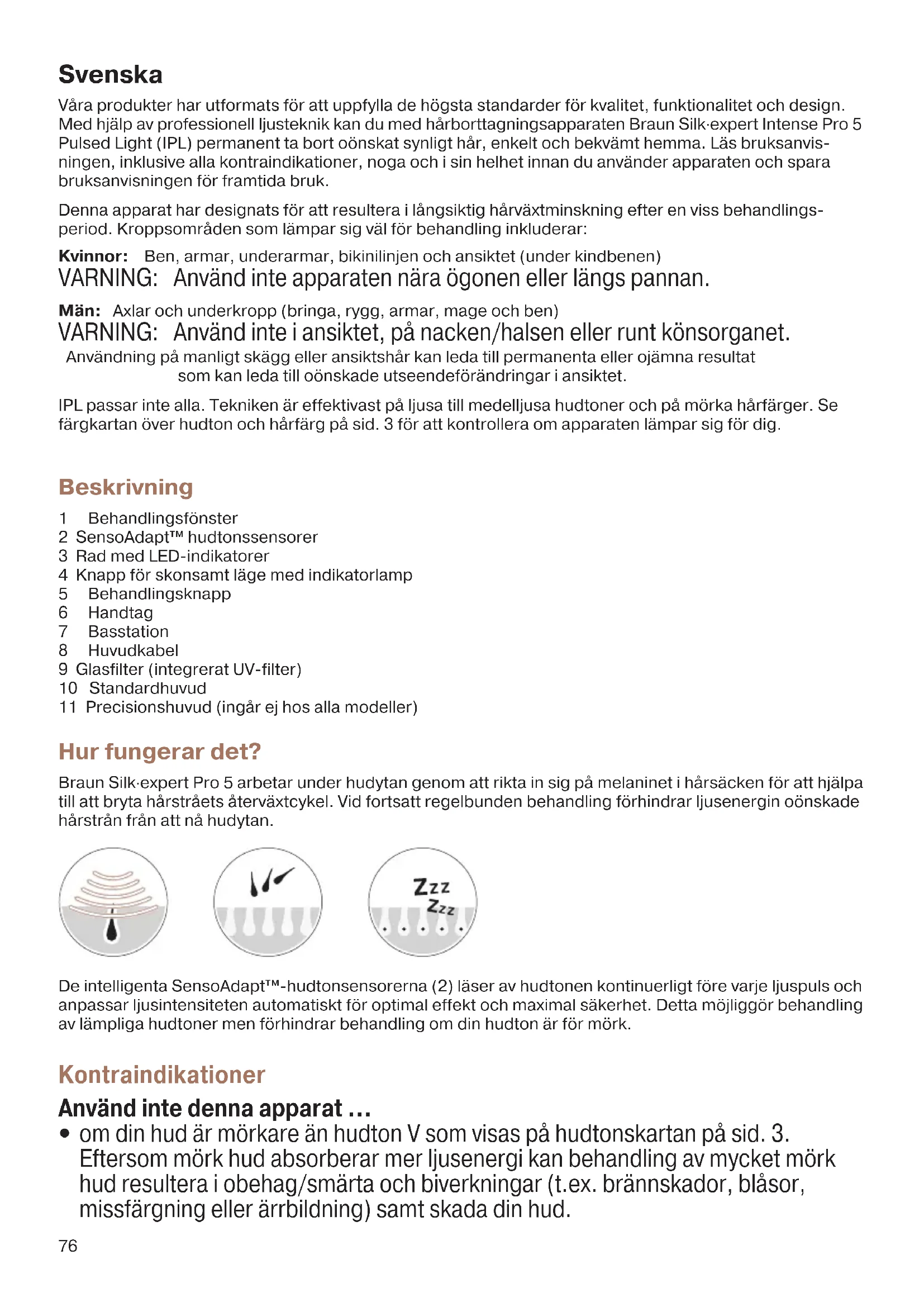 For varer kjøpt i Norge har kunden garanti i henhold til NELs leveringsbetingelser. 91816146_Victoria_Pro5_Euro_01.indd 7591816146_Victoria_Pro5_Euro_01.indd 75 28.06.18 14:4928.06.18 14:49 Business Use - P&G AUTHORIZED POA-00053643 Rev 001 Effective Date 2018-07-02 Printed 2018-07-25 Page 75 of 9476 Svenska Våra produkter har utformats för att uppfylla de högsta standarder för kvalitet, funktionalitet och design. Med hjälp av professionell ljusteknik kan du med hårborttagningsapparaten Braun Silk·expert Intense Pro 5 Pulsed Light (IPL) permanent ta bort oönskat synligt hår, enkelt och bekvämt hemma. Läs bruksanvis- ningen, inklusive alla kontraindikationer, noga och i sin helhet innan du använder apparaten och spara bruksanvisningen för framtida bruk. Denna apparat har designats för att resultera i långsiktig hårväxtminskning efter en viss behandlings- period. Kroppsområden som lämpar sig väl för behandling inkluderar: Kvinnor: Ben, armar, underarmar, bikinilinjen och ansiktet (under kindbenen) VARNING: Använd inte apparaten nära ögonen eller längs pannan. Män: Axlar och underkropp (bringa, rygg, armar, mage och ben) VARNING: Använd inte i ansiktet, på nacken/halsen eller runt könsorganet. Användning på manligt skägg eller ansiktshår kan leda till permanenta eller ojämna resultat som kan leda till oönskade utseendeförändringar i ansiktet. IPL passar inte alla. Tekniken är effektivast på ljusa till medelljusa hudtoner och på mörka hårfärger. Se färgkartan över hudton och hårfärg på sid. 3 för att kontrollera om apparaten lämpar sig för dig. Beskrivning 1 Behandlingsfönster 2 SensoAdapt™ hudtonssensorer 3 Rad med LED-indikatorer 4 Knapp för skonsamt läge med indikatorlamp 5 Behandlingsknapp 6 Handtag 7 Basstation 8 Huvudkabel 9 Glasfilter (integrerat UV-filter) 10 Standardhuvud 11 Precisionshuvud (ingår ej hos alla modeller) Hur fungerar det? Braun Silk·expert Pro 5 arbetar under hudytan genom att rikta in sig på melaninet i hårsäcken för att hjälpa till att bryta hårstråets återväxtcykel. Vid fortsatt regelbunden behandling förhindrar ljusenergin oönskade hårstrån från att nå hudytan. De intelligenta SensoAdapt™-hudtonsensorerna (2) läser av hudtonen kontinuerligt före varje ljuspuls och anpassar ljusintensiteten automatiskt för optimal effekt och maximal säkerhet. Detta möjliggör behandling av lämpliga hudtoner men förhindrar behandling om din hudton är för mörk. Kontraindikationer Använd inte denna apparat ...