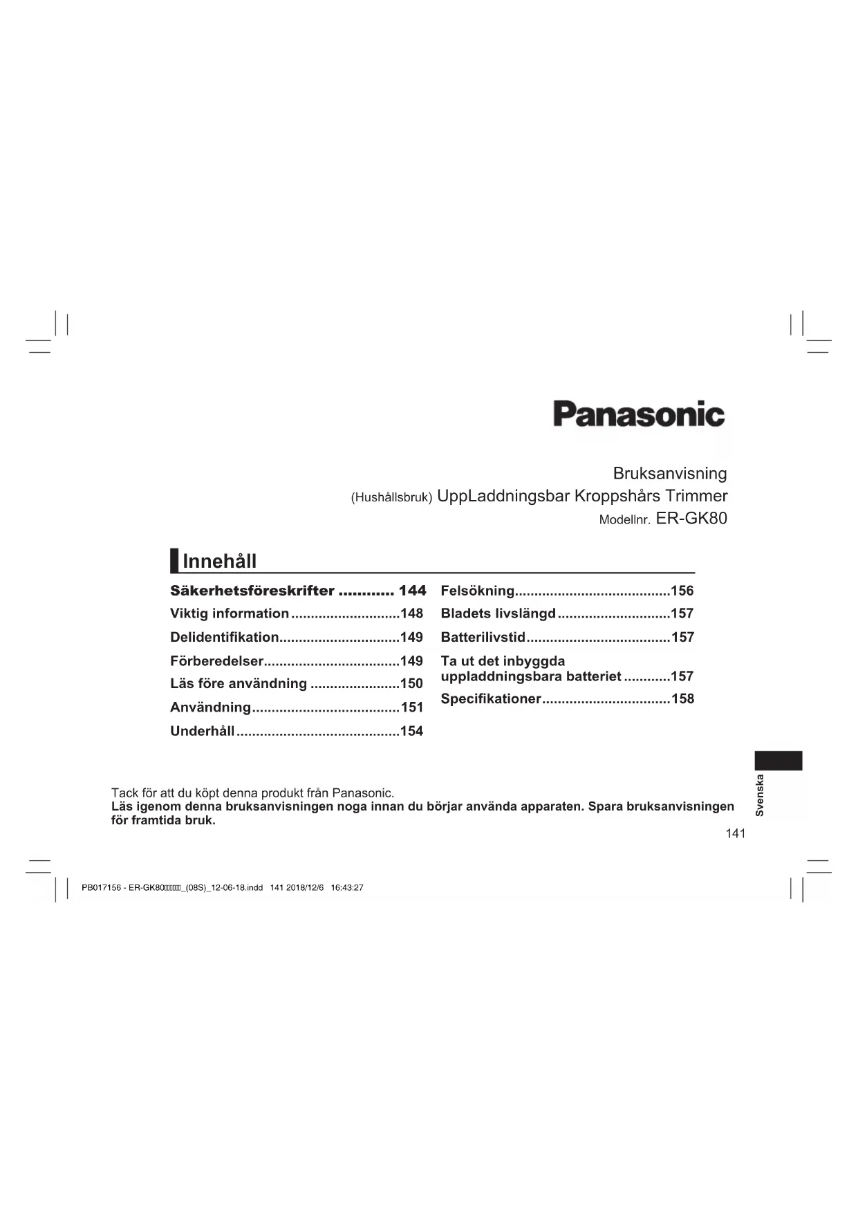 Kontakta läkare omedelbart. PB017156 - ER-GK80_(08S)_12-06-18.indd 147 2018/12/6 16:43:28148 Svenska VARNING Efter att du tagit bort batteriet, förvara det inte inom räckhåll för barn och spädbarn. ‑ Batteriet orsakar skador på kroppen om du råkar svälja det.
