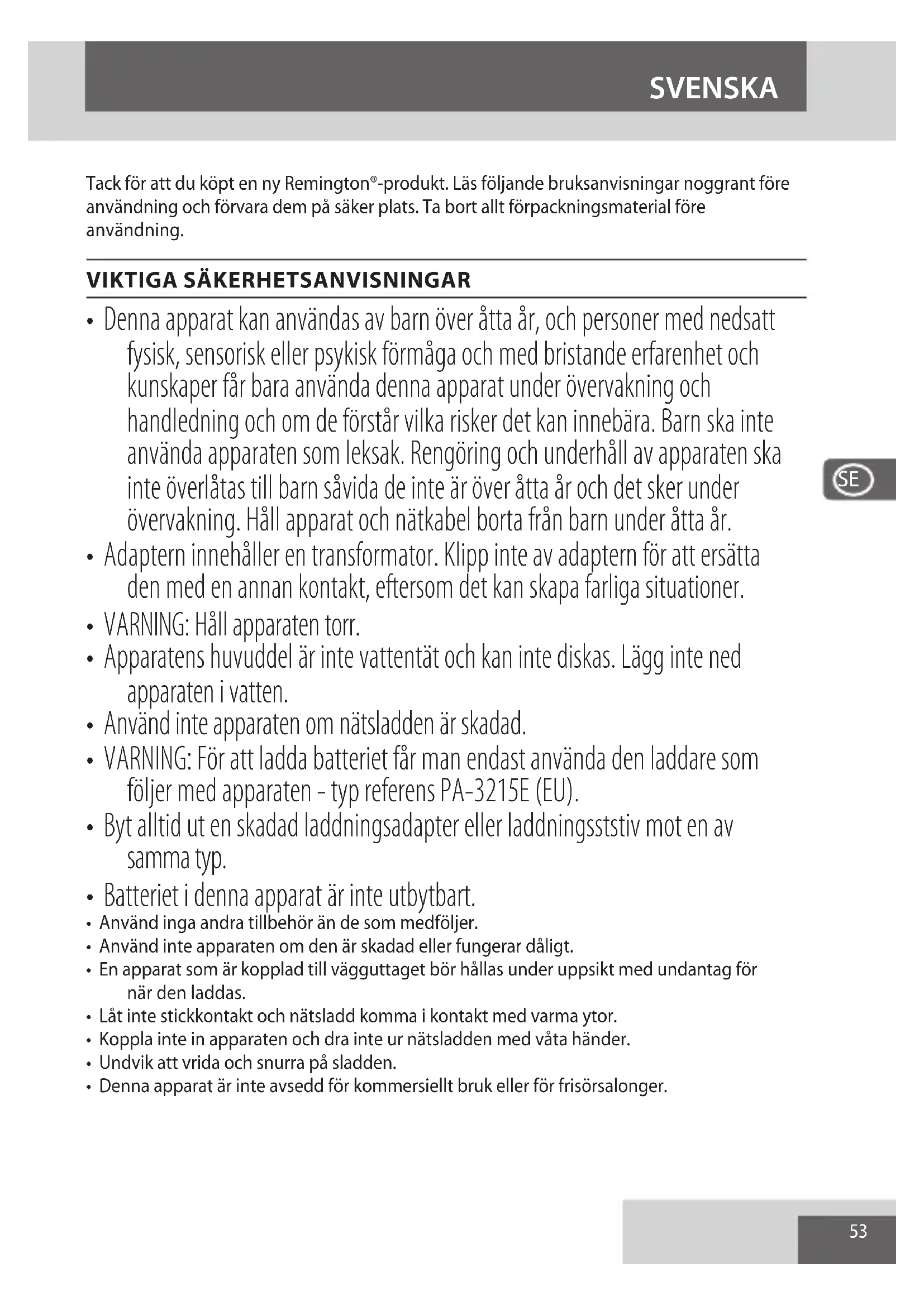 För att undvika miljö- och hälsoproblem pga. farliga ämnen får man inte kassera apparater eller laddningsbara och icke-laddningsbara batterier märkta med någon av dessa symboler i osorterat kommunalt avfall. Elektriska och elektroniska produkter och, där tillämpligt, laddningsbara och icke-laddningsbara batterier ska alltid kasseras vid en lämplig, ociell återvinnings-/uppsamlingsstation.60 Takk for at du kjøper et nytt Remington®-produkt. Vennligst les denne bruksanvisningen godt og legg den på et trygt sted. Fjern all emballasje før bruk. VIKTIG SIKKERHETSTILTAK