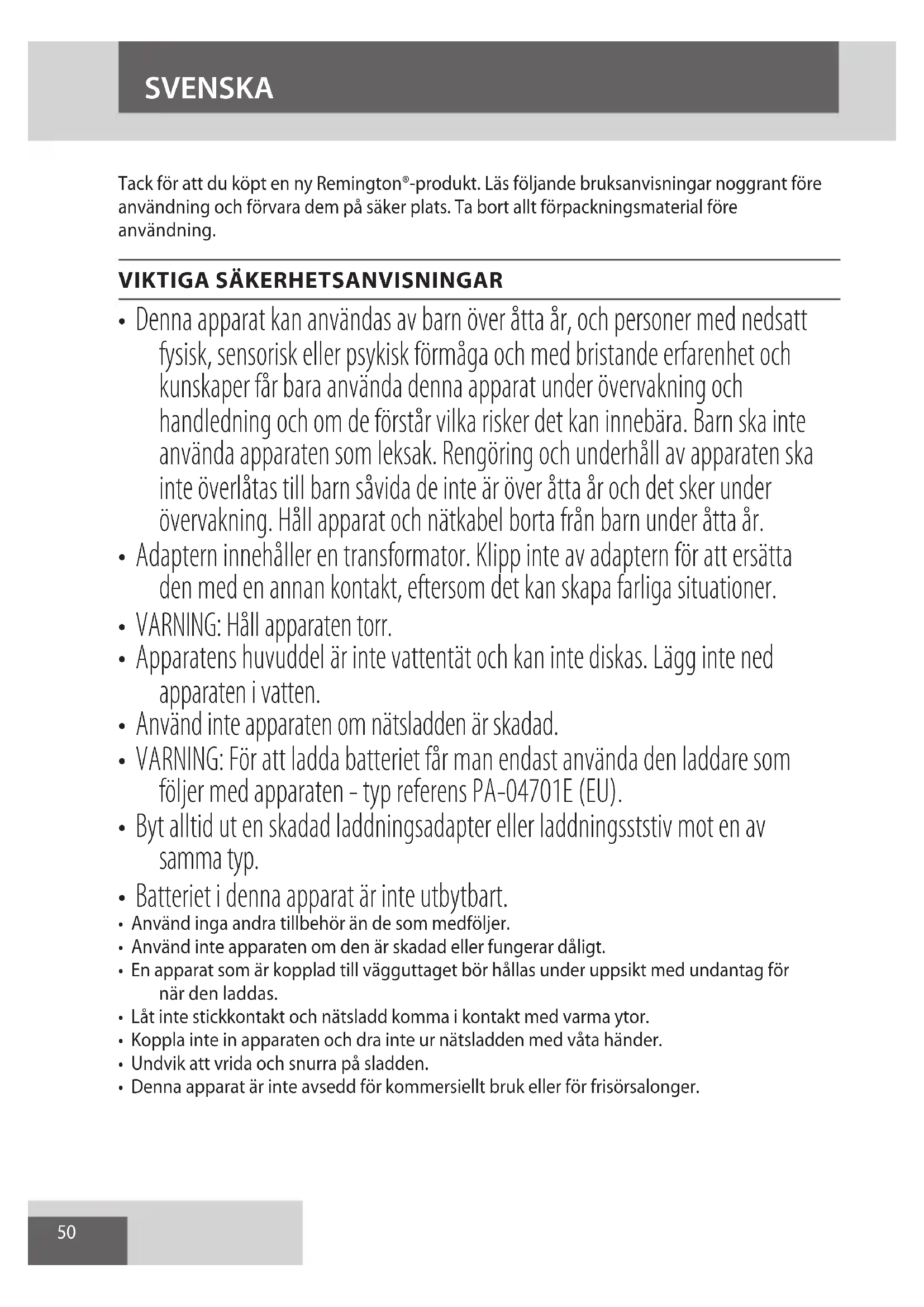 - Denna apparat är inte avsedd för kommersiellt bruk eller för frisörsalonger. SVENSKA51 SVENSKA