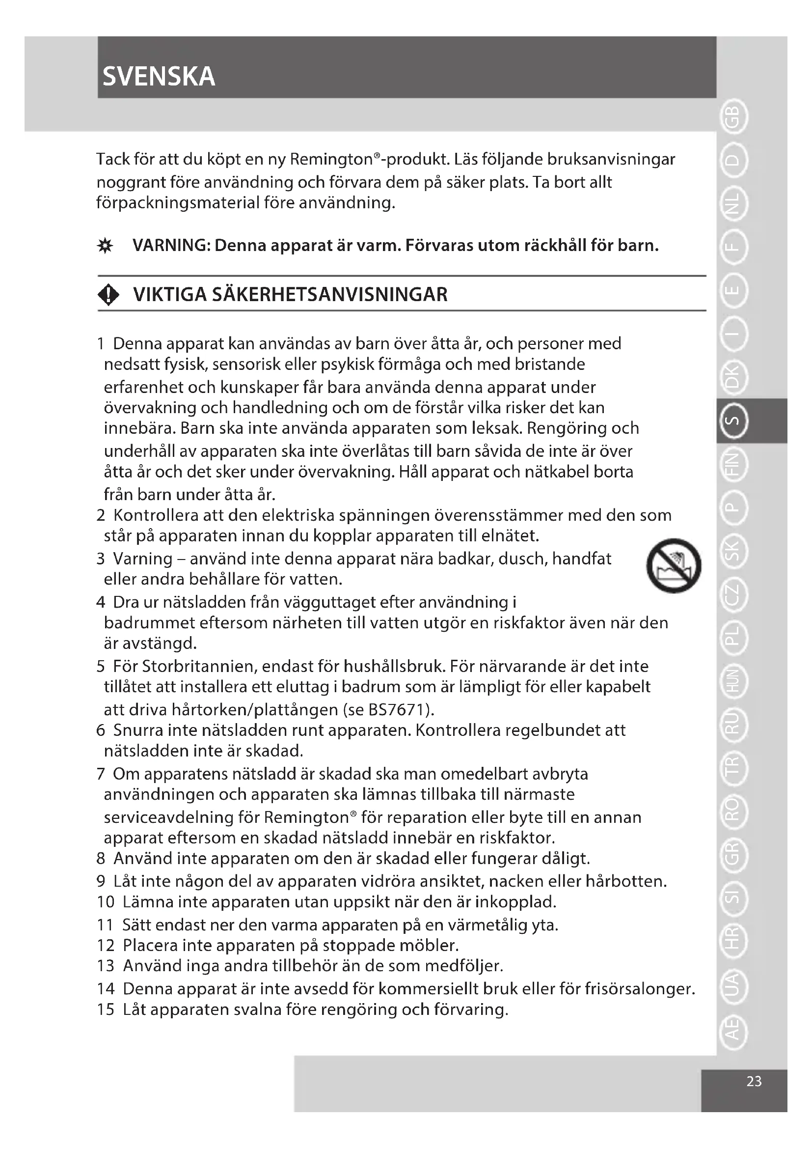 For at undgå sundheds- og miljøproblemer grundet farlige stoer i elektriske og elektroniske forbrugsgoder, må apparater mærket med dette symbol ikke bortkastes sammen med usorteret husholdningsaald, men skal genanvendes eller genbruges. DANSK23 Tack för att du köpt en ny Remington®-produkt. Läs följande bruksanvisningar noggrant före användning och förvara dem på säker plats. Ta bort allt förpackningsmaterial före användning. , VARNING: Denna apparat är varm. Förvaras utom räckhåll för barn.