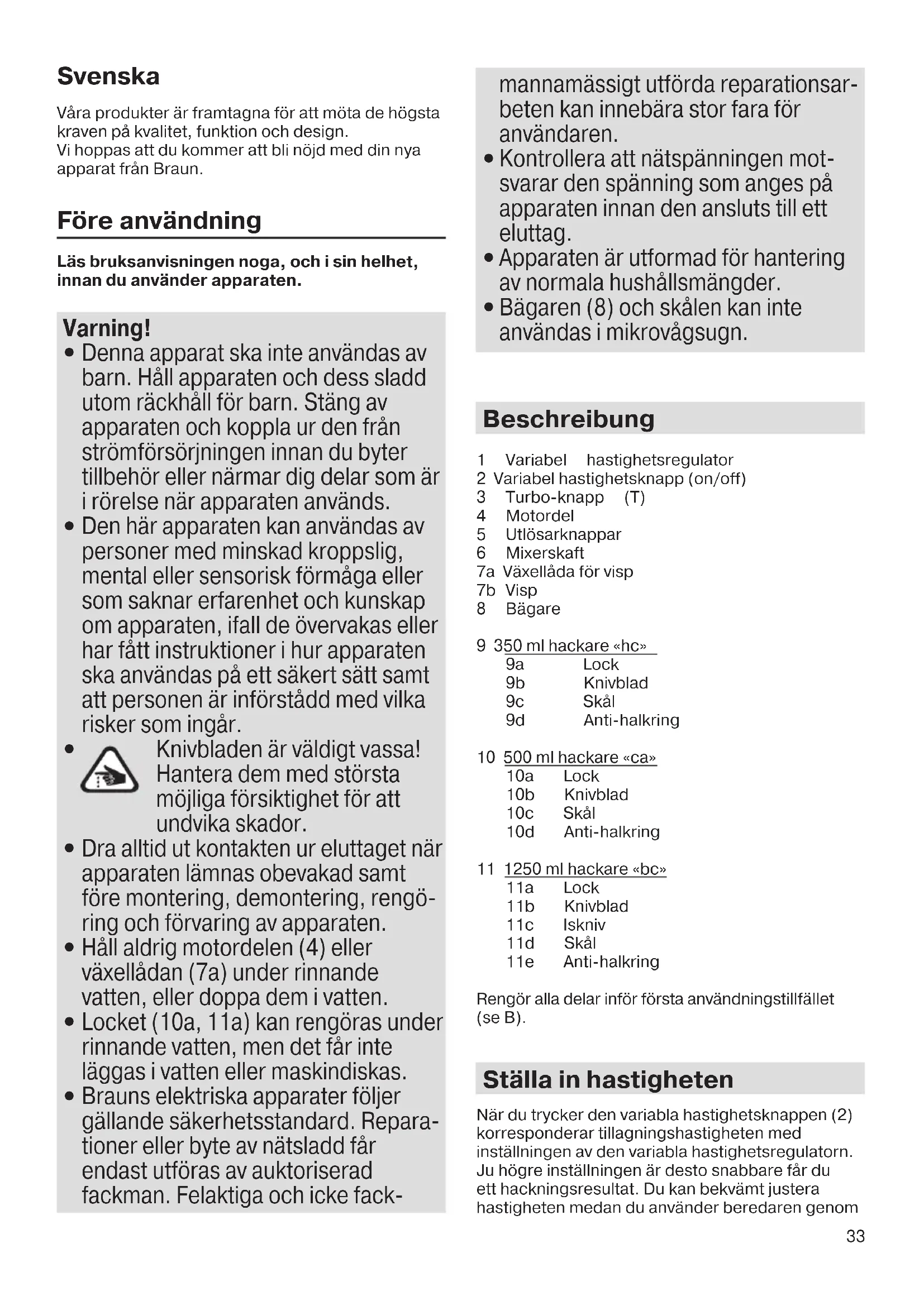 Brauns elektriska apparater följer gällande säkerhetsstandard. Repara- tioner eller byte av nätsladd får endast utföras av auktoriserad fackman. Felaktiga och icke fack- mannamässigt utförda reparationsar- beten kan innebära stor fara för användaren.