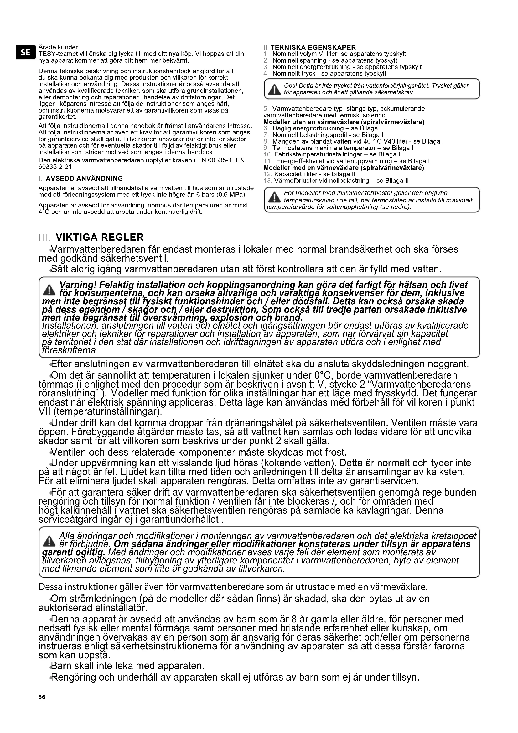 Ärade kunder, TESY-teamet vill önska dig lycka till med ditt nya köp. Vi hoppas att din nya apparat kommer att göra ditt hem mer bekvämt. Denna tekniska beskrivning och instruktionshandbok är gjord för att du ska kunna bekanta dig med produkten och villkoren för korrekt installation och användning. Dessa instruktioner är också avsedda att användas av kvalicerade tekniker, som ska utföra grundinstallationen, eller demontering och reparationer i händelse av driftstörningar. Det ligger i köparens intresse att följa de instruktioner som anges häri, och instruktionerna motsvarar ett av garantivillkoren som visas på garantikortet. Att följa instruktionerna i denna handbok är främst i användarens intresse. Att följa instruktionerna är även ett krav för att garantivillkoren som anges för garantiservice skall gälla. Tillverkaren ansvarar därför inte för skador på apparaten och för eventuella skador till följd av felaktigt bruk eller installation som strider mot vad som anges i denna handbok. Den elektriska varmvattenberedaren uppfyller kraven i EN 60335-1, EN 60335-2-21.