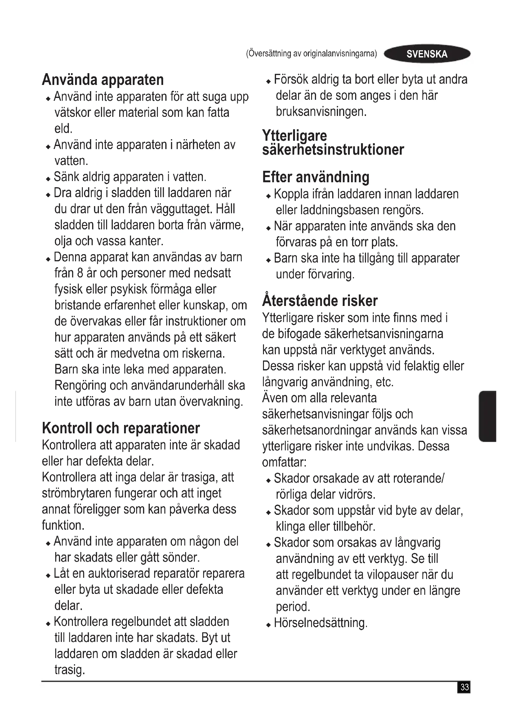 Denna apparat kan användas av barn fran 8 År och personer med nedsatt fysisk eller psyisk formåga eller bristande erfarenhet eller kunskap, om de örvakas eller fär instruktioner om hur apparaten används på att sækert sätt och är medvetna om riskerna. Barn skä inte leka med apparaten. Rengöring och användarunderhäll skä inte utforas av barn utan örvakning.