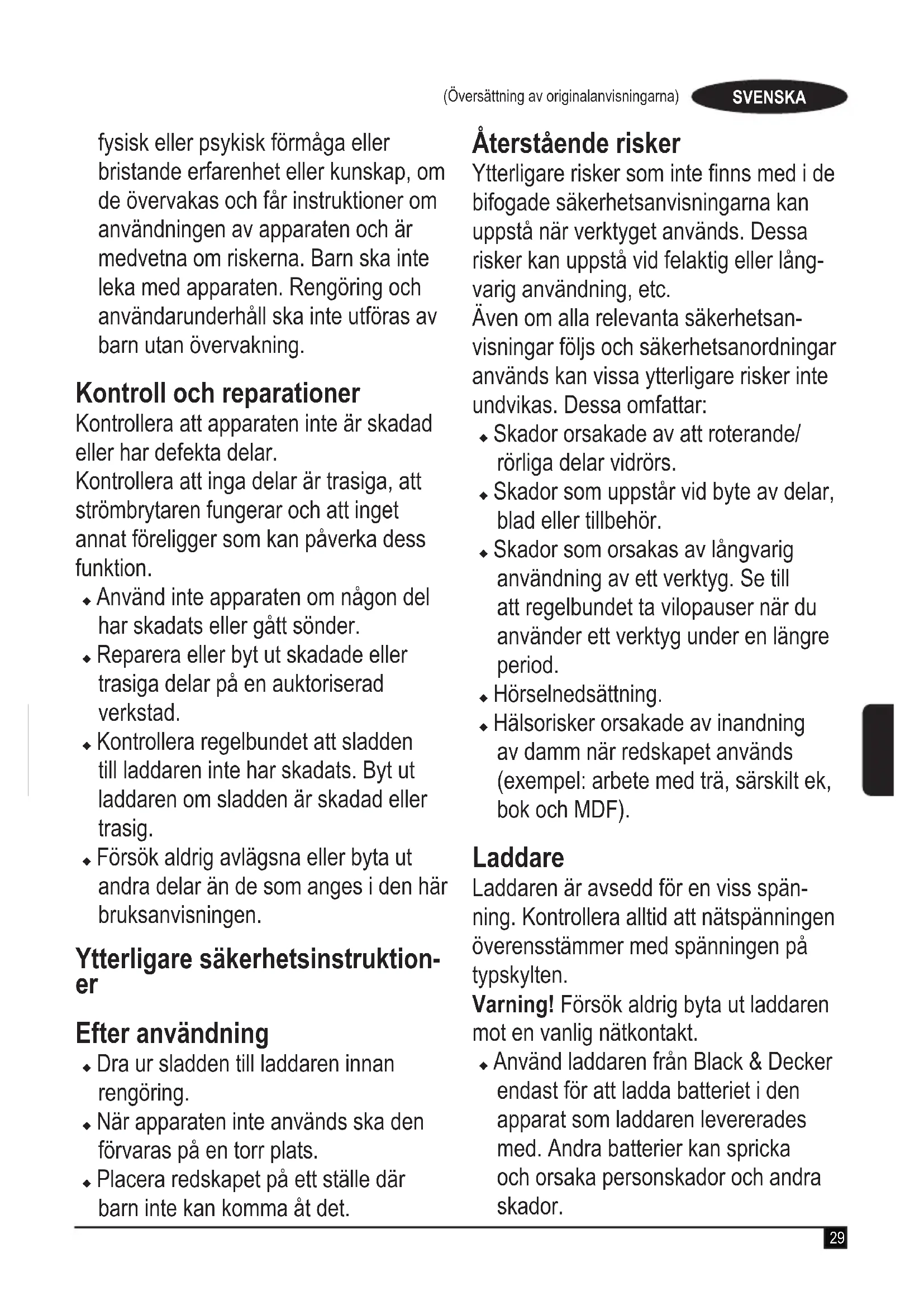 Efter användning u Dra ur sladden till laddaren innan rengöring. u När apparaten inte används ska den förvaras på en torr plats. u Placera redskapet på ett ställe där barn inte kan komma åt det. Återstående risker Ytterligare risker som inte nns med i de bifogade säkerhetsanvisningarna kan uppstå när verktyget används. Dessa risker kan uppstå vid felaktig eller lång- varig användning, etc. Även om alla relevanta säkerhetsan- visningar följs och säkerhetsanordningar används kan vissa ytterligare risker inte undvikas. Dessa omfattar: u Skador orsakade av att roterande/ rörliga delar vidrörs. u Skador som uppstår vid byte av delar, blad eller tillbehör. u Skador som orsakas av långvarig användning av ett verktyg. Se till att regelbundet ta vilopauser när du använder ett verktyg under en längre period. u Hörselnedsättning.u Hälsorisker orsakade av inandning av damm när redskapet används (exempel: arbete med trä, särskilt ek, bok och MDF). Laddare Laddaren är avsedd för en viss spän- ning. Kontrollera alltid att nätspänningen överensstämmer med spänningen på typskylten. Varning! Försök aldrig byta ut laddaren mot en vanlig nätkontakt. u Använd laddaren från Black & Decker endast för att ladda batteriet i den apparat som laddaren levererades med. Andra batterier kan spricka och orsaka personskador och andra skador.30 (Översättning av originalanvisningarna)SVENSKAu Försök aldrig ladda batterier som inte är uppladdningsbara. u Om nätsladden är skadad måste den bytas ut av tillverkaren eller en auktoriserad BLACK+DECKER- verkstad för att undvika farliga situationer. u Utsätt inte laddaren för vatten.u Öppna inte laddaren.u Gör ingen åverkan på laddaren.u Apparaten/batteriet ska placeras på en plats med god ventilation vid laddning. Elsäkerhet Symboler på laddaren Läs hela den här bruksanvisningen noggrant innan du använder apparaten.