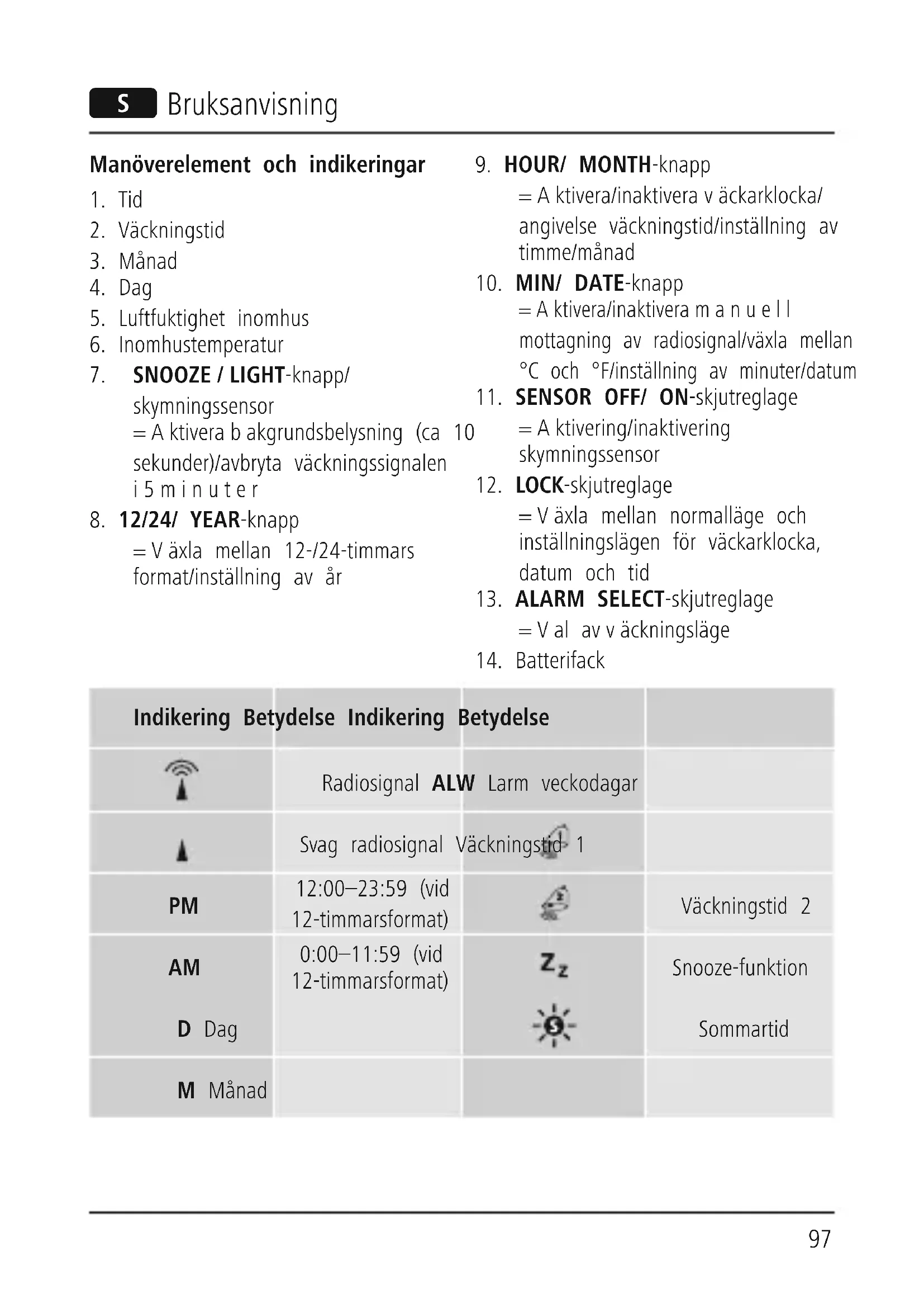 0:00–11:59 (vid 12-timmarsformat) Snooze-funktion D Dag Sommartid M Månad98
